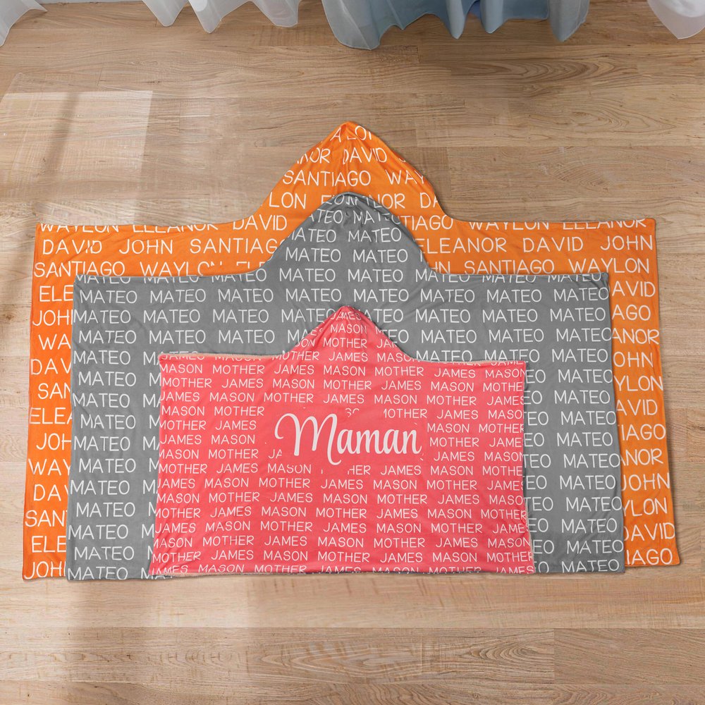Cette couverture à capuche est disponible dans une variété de couleurs et peut être personnalisée avec jusqu'à 20 noms d'enfants en caractères d'imprimerie, ainsi qu'un ou deux prénoms au milieu ou titres. C'est le cadeau idéal pour les mères, les grands-mères ou les familles avec plusieurs enfants, car il ajoute une touche personnelle à leur confort.