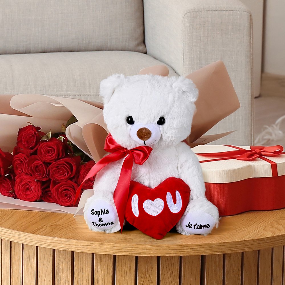 Cette poupée ourson séduit immédiatement par son apparence charmante. Disponible en marron et en blanc, elle s'adresse à des esthètes différents. Orné d'un nœud rouge vif, il ajoute une touche de romantisme. Le cœur rouge qu'il tient étroitement est orné du mot "amour" ou "je t'aime", exprimant l'affection de manière chaleureuse et directe. Vous pouvez personnaliser le texte sur les pattes de l'ours, ce qui en fait un moyen parfait pour exprimer la douceur et le romantisme. De plus, vous pouvez l'accompagner de roses pour renforcer le caractère romantique du geste.