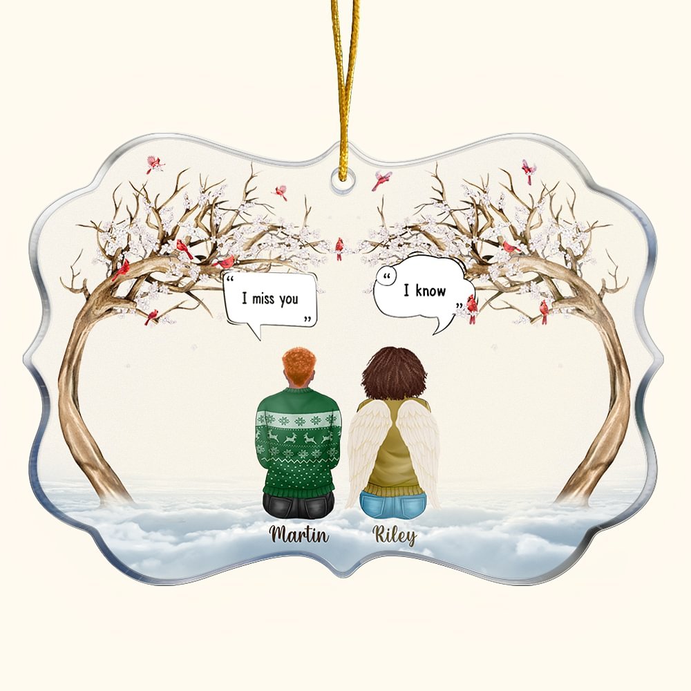 De conception unique, cette décoration suspendue en acrylique présente une scène charmante combinée à un élément de Noël qui montre une image réconfortante de famille ou d'amis passant du temps ensemble. Avec l'ajout de l'inscription "I Miss You I Know" et d'un message personnalisé, il s'agit d'un souvenir spécial qui célèbre l'amour éternel entre les gens.