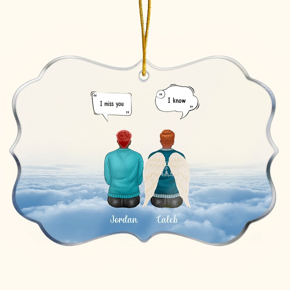 De conception unique, cette décoration suspendue en acrylique présente une scène charmante combinée à un élément de Noël qui montre une image réconfortante de famille ou d'amis passant du temps ensemble. Avec l'ajout de l'inscription "I Miss You I Know" et d'un message personnalisé, il s'agit d'un souvenir spécial qui célèbre l'amour éternel entre les gens.