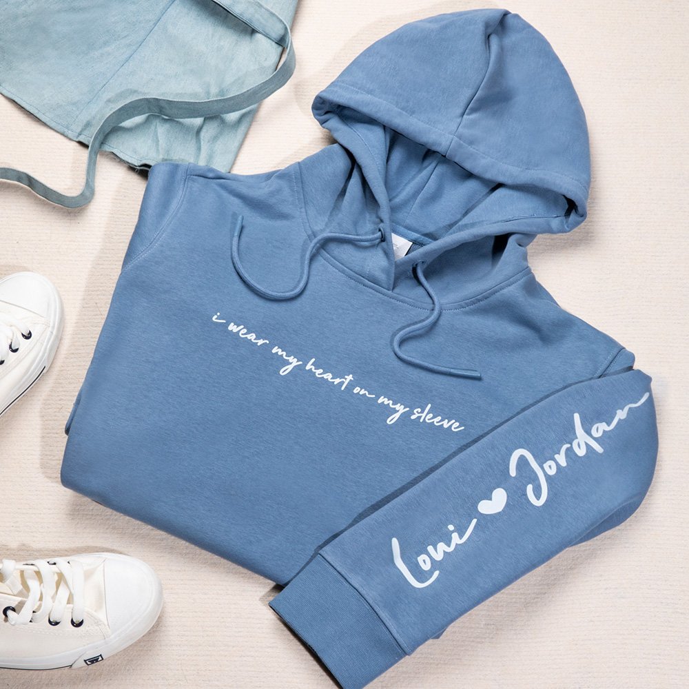 La phrase "I Wear My Heart On My Sleeve" (Je porte mon cœur sur ma manche) représente l'amour profond et le lien émotionnel qu'une femme entretient avec ses proches. En ajoutant des noms au sweat à capuche, il devient une pièce personnalisée et expressive.