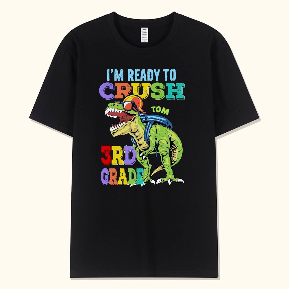 Si vous cherchez quelque chose à porter pour votre enfant le premier jour d'école afin d'attirer l'attention de tous, vous ne pouvez pas manquer ce t-shirt sur lequel est imprimé "I'm Ready to Crush". Avec un dinosaure portant un sac d'école imprimé, c'est un t-shirt super cool pour les enfants. Faites-leur une grande surprise avec ce t-shirt !