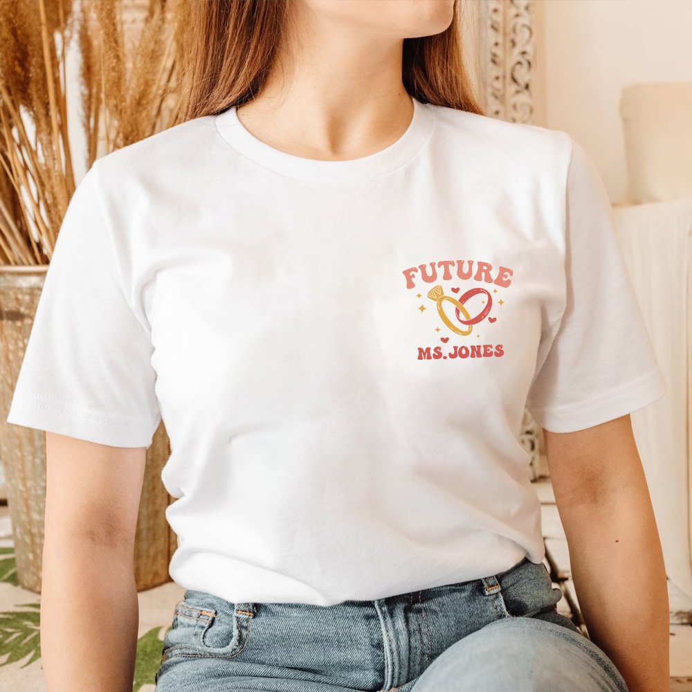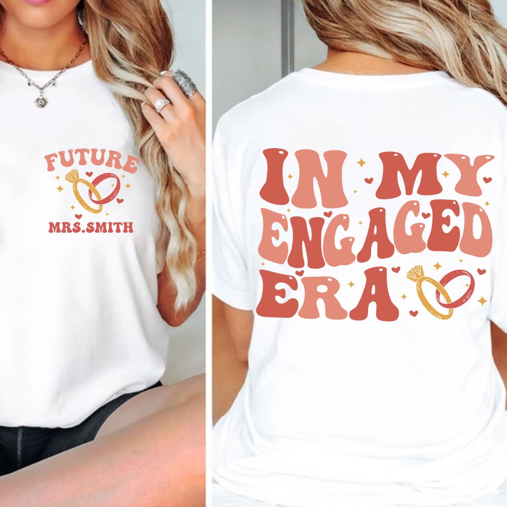 Le dos de cette chemise ou de ce sweat-shirt comporte la déclaration "In My Engaged Era" ainsi qu'une paire d'anneaux. La partie avant gauche de la poitrine peut être personnalisée avec le nom du destinataire. Ce motif unique symbolise la beauté de l'amour et des fiançailles, ce qui en fait un cadeau idéal pour quelqu'un de spécial.