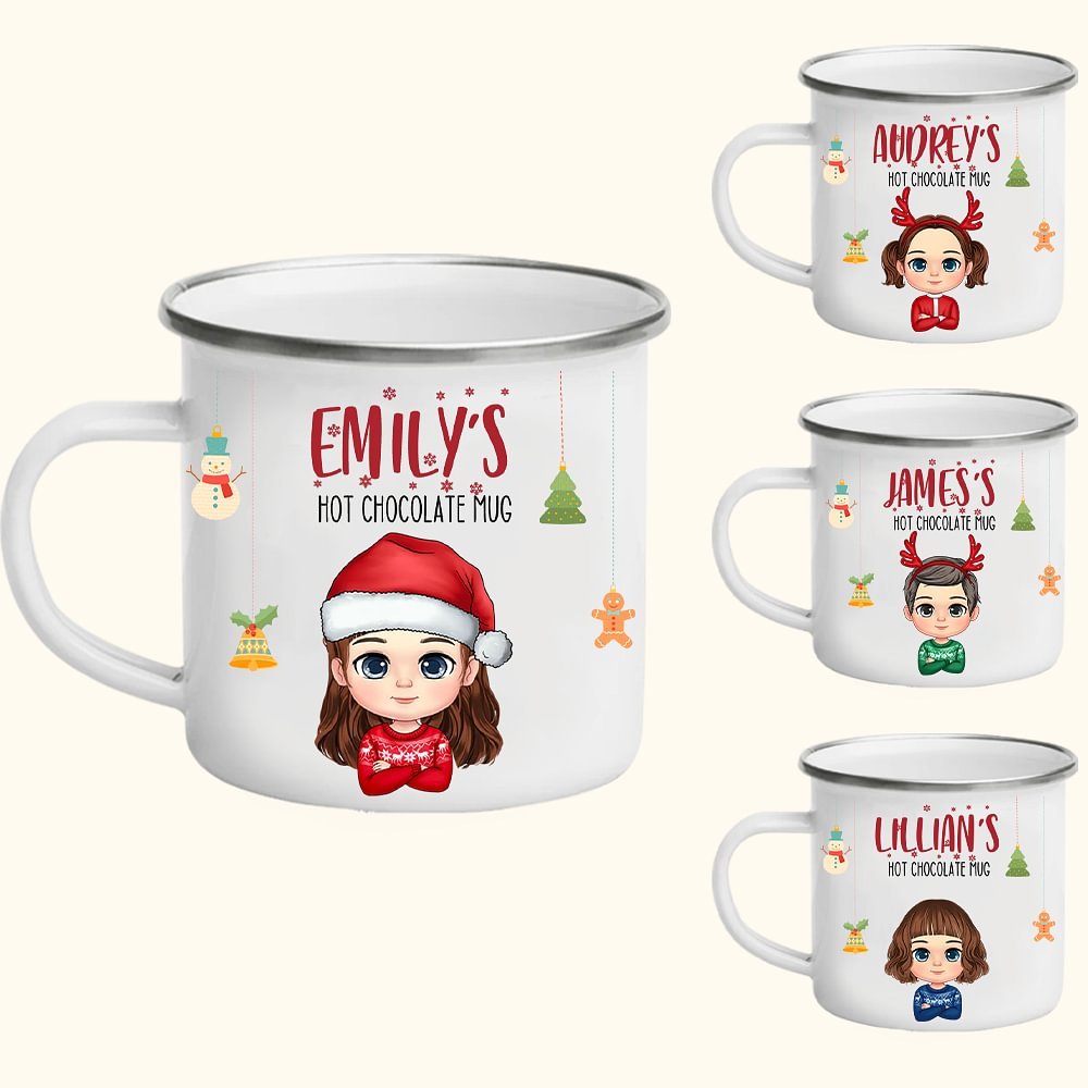 Ce mug présente des personnages de dessins animés avec des éléments de Noël tels que des bonshommes de neige, des feuilles de houx, des cloches, des bonshommes en pain d'épices, etc. qui ne manqueront pas de faire sourire les garçons et les filles. Le charmant bord argenté ajoute une touche d'élégance, transformant cet objet de tous les jours en une décoration que les enfants adoreront. Vous pouvez ajouter le nom de votre enfant et un texte particulier pour en faire un mug en émail unique.