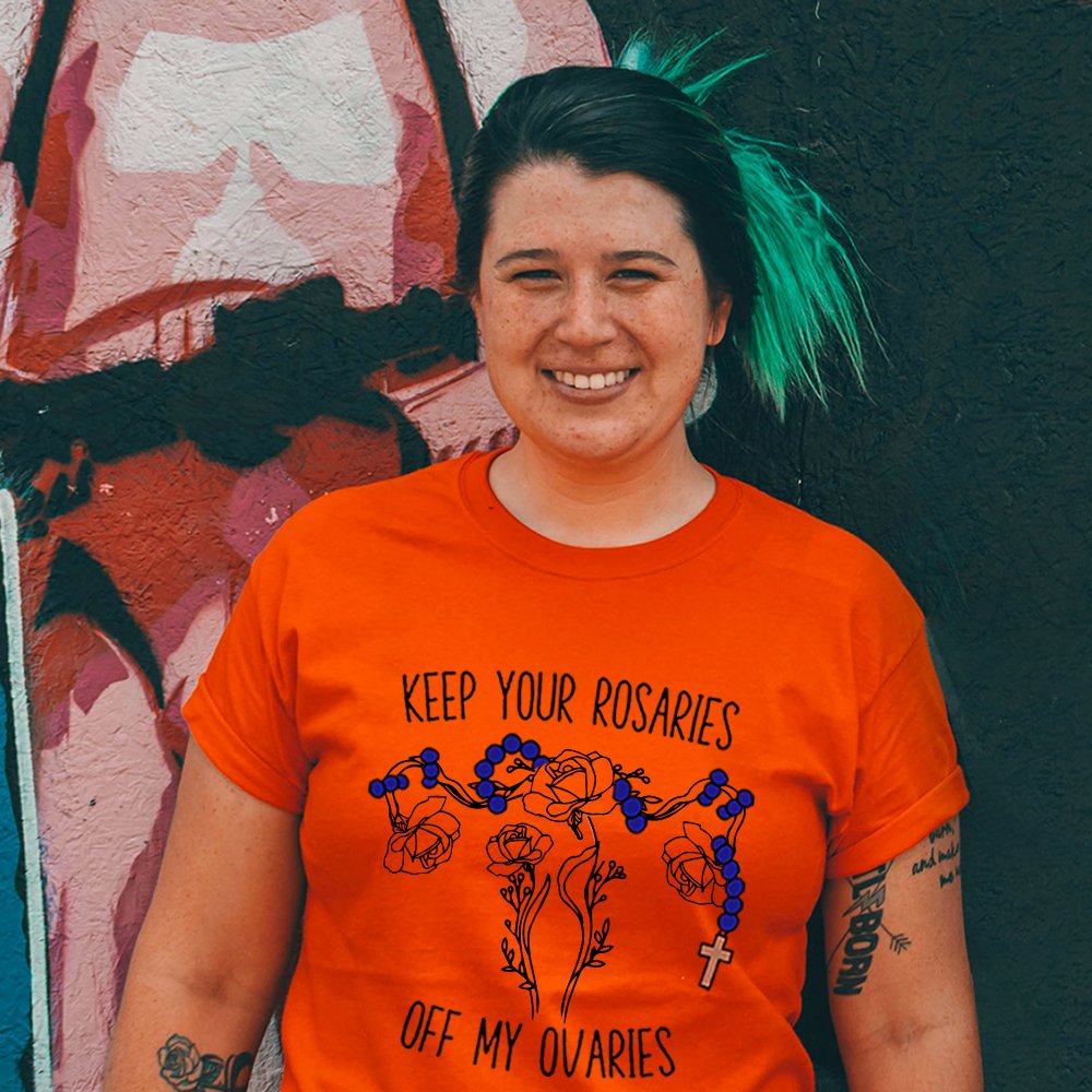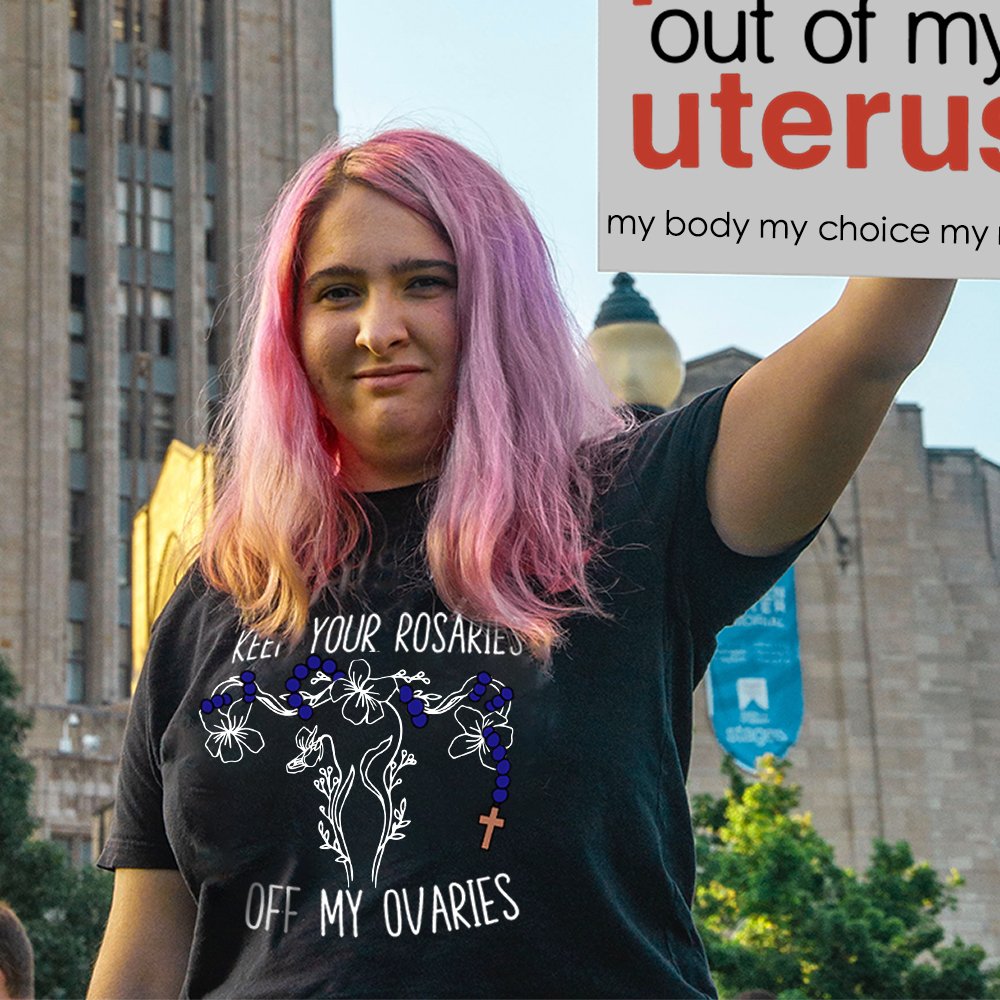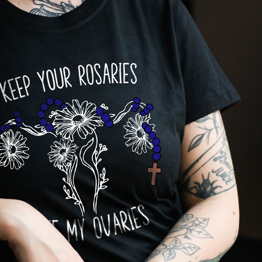 Le fond de ce T-shirt est basé sur l'interdiction de l'avortement pour toutes les raisons, qui a conduit à un grand nombre de femmes à manifester. "Gardez vos chapelets loin de mes ovaires" se veut une référence satirique aux conservateurs et aux hommes d'église qui semblent être sur le terrain moral, interdisant tous les actes d'avortement au motif qu'ils constituent une violation des droits de l'homme. La fleur de naissance est une représentation de l'individu et la combinaison de la fleur avec l'organe de l'utérus féminin est censée être une expression plus importante de ses griefs et de son désir de défendre les femmes. Ce produit est une combinaison de la fleur de naissance et de l'image de l'utérus pour faire une déclaration.