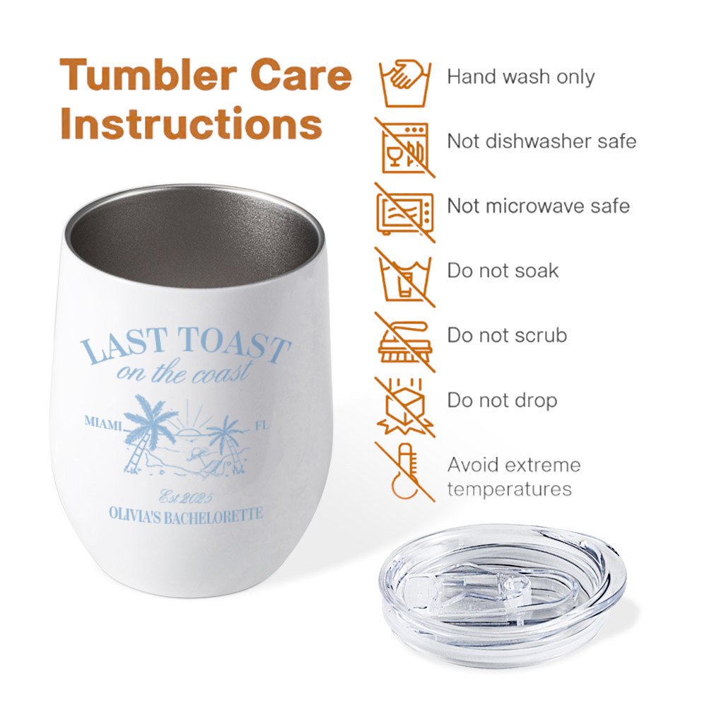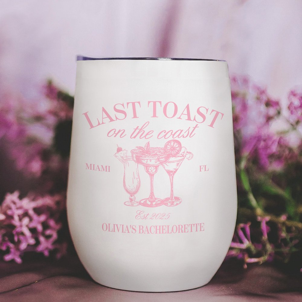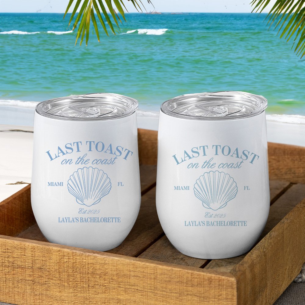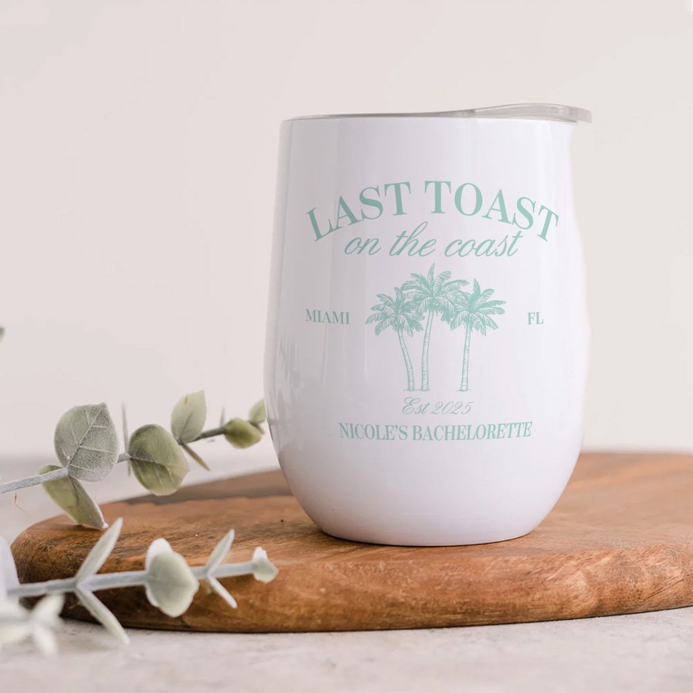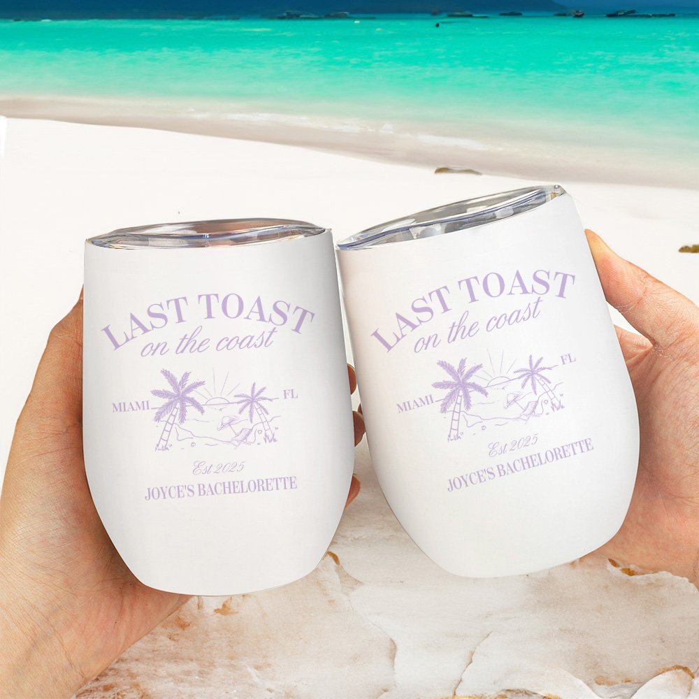 Ce gobelet présente un design élégant et moderne qui incarne l'insouciance de la vie côtière. L'impression "Last Toast On The Coast" est complétée par des motifs captivants sur le thème de la plage et des cocktails, créant ainsi un accessoire visuellement frappant qui met de l'ambiance pour les journées ensoleillées. L'ajout de l'état, de la ville, de l'année et du nom au design transforme le gobelet en un souvenir unique.