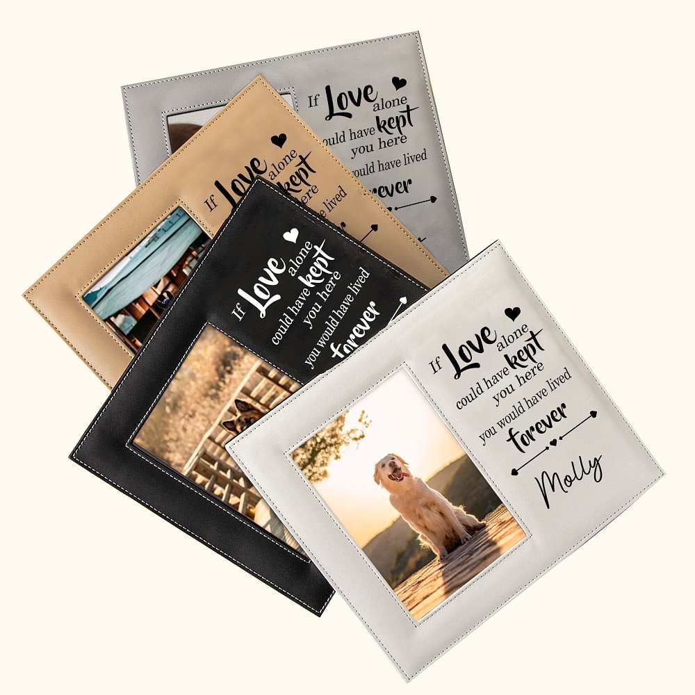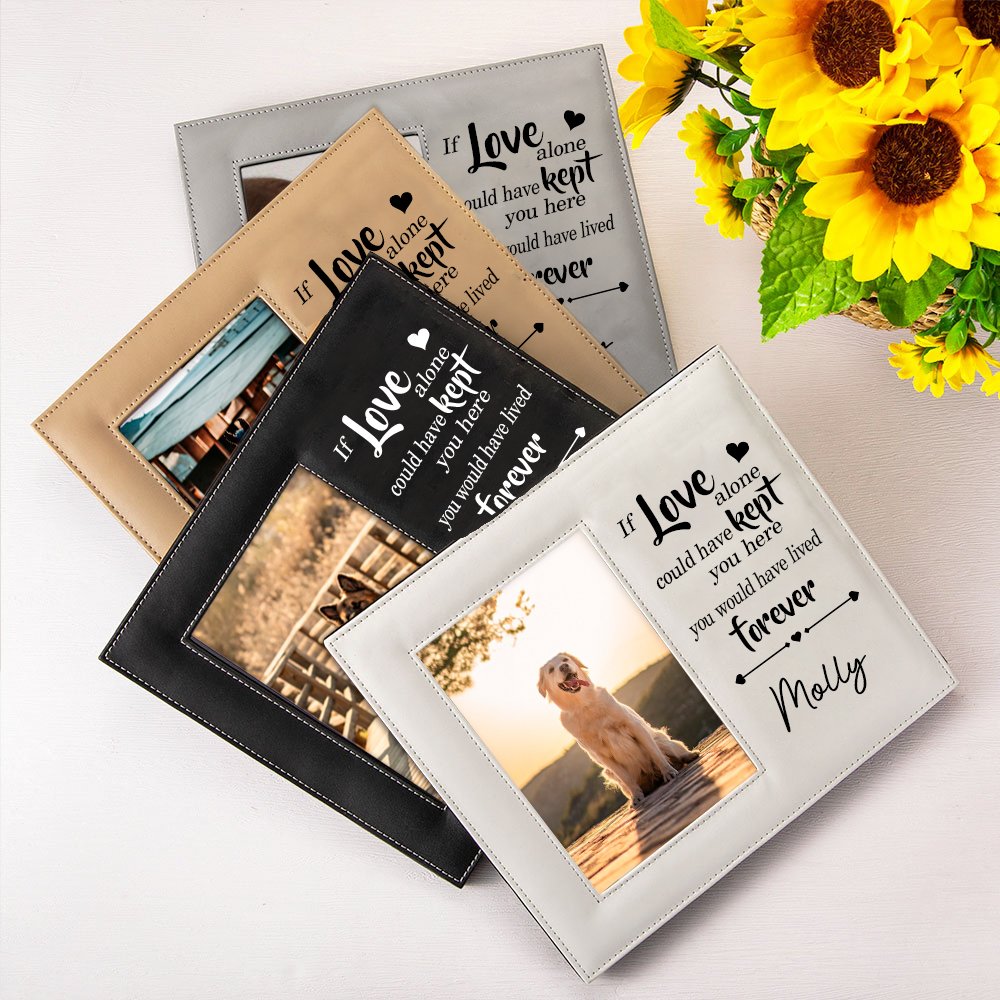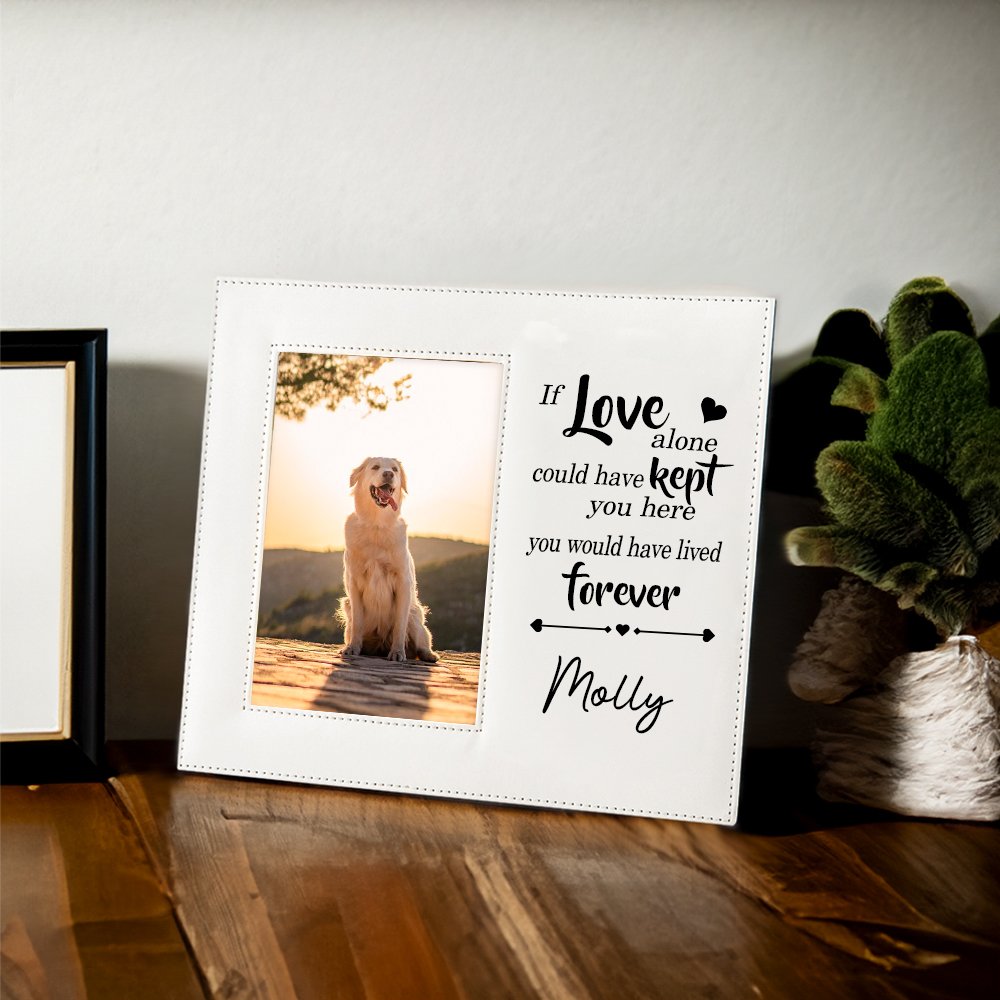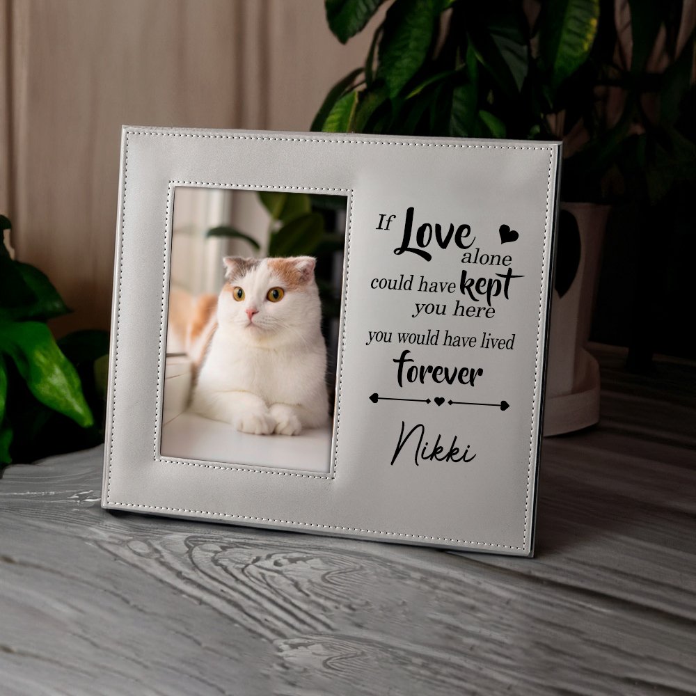 La citation sur ce cadre photo est... Si seulement l'amour pouvait vous garder ici, vous vivriez éternellement. Associé à la photo et au nom de l'animal, ce cadre est unique. Disponible en quatre couleurs différentes, vous pouvez choisir selon vos préférences personnelles.