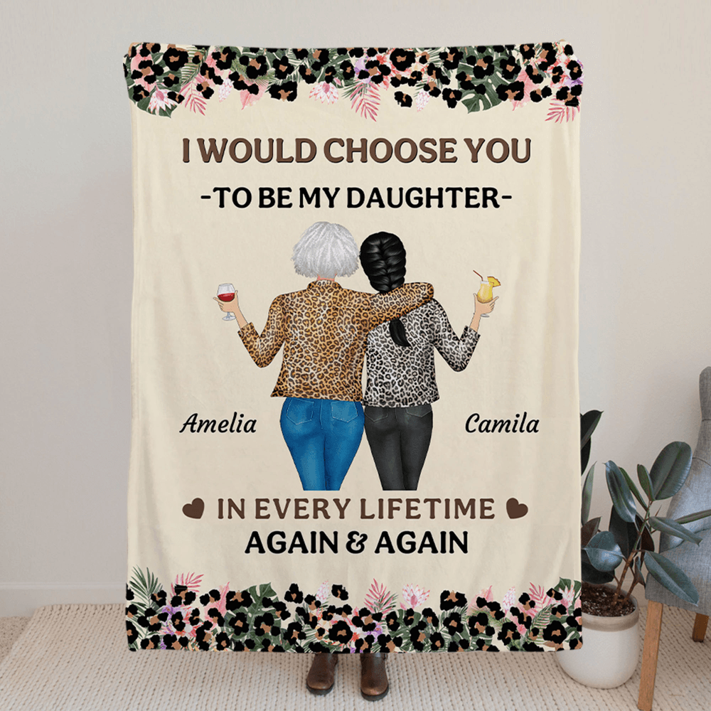 Le texte "I WOULD CHOOSE YOU - TO BE MY DAUGHTER - IN EVERY LIFETIME AGAIN & AGAIN" (Je te choisirais pour être ma fille à chaque vie, encore et encore) est affiché dans une police de caractères chaleureuse. Les bords sont décorés de fleurs imprimées léopard et de feuilles tropicales, créant ainsi un look douillet et élégant. Vous pouvez personnaliser les personnages du dessin animé pour qu'ils vous ressemblent, à vous et à votre mère. Ajoutez vos deux noms pour que la couverture soit unique.