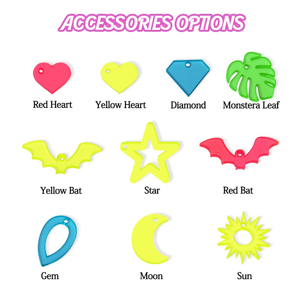L'étiquette de collier pour animaux est livrée avec un mini accessoire, offrant 10 styles différents au choix : diamant, cœur rouge, cœur jaune, soleil, feuille de monstera, étoile, pierre précieuse, chauve-souris jaune, chauve-souris rouge et lune. Vous pouvez choisir celui qui correspond le mieux à la personnalité et au style de votre animal.