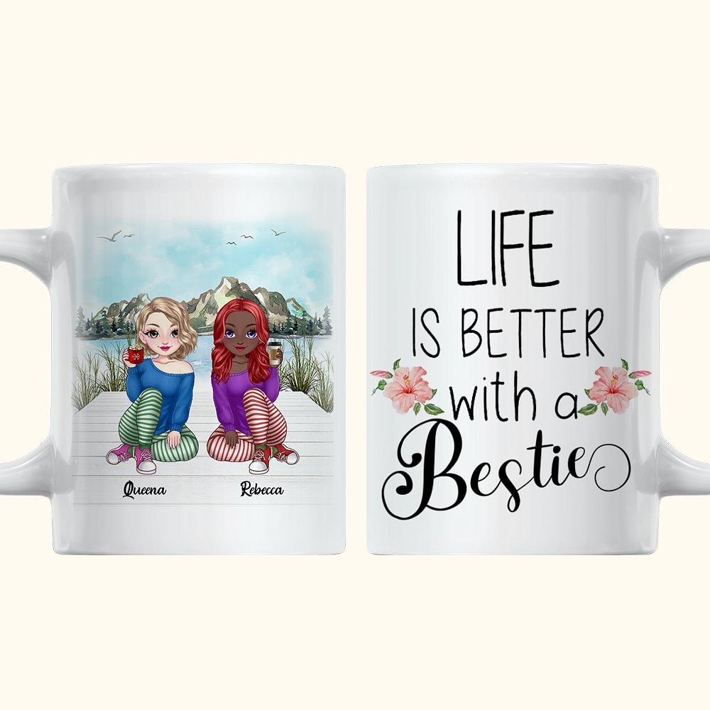 La vie est meilleure personnalisée avec une tasse en céramique blanche Bestie Mountain Lake View Cadeaux Bestie pour femme pour le bureau et la maison