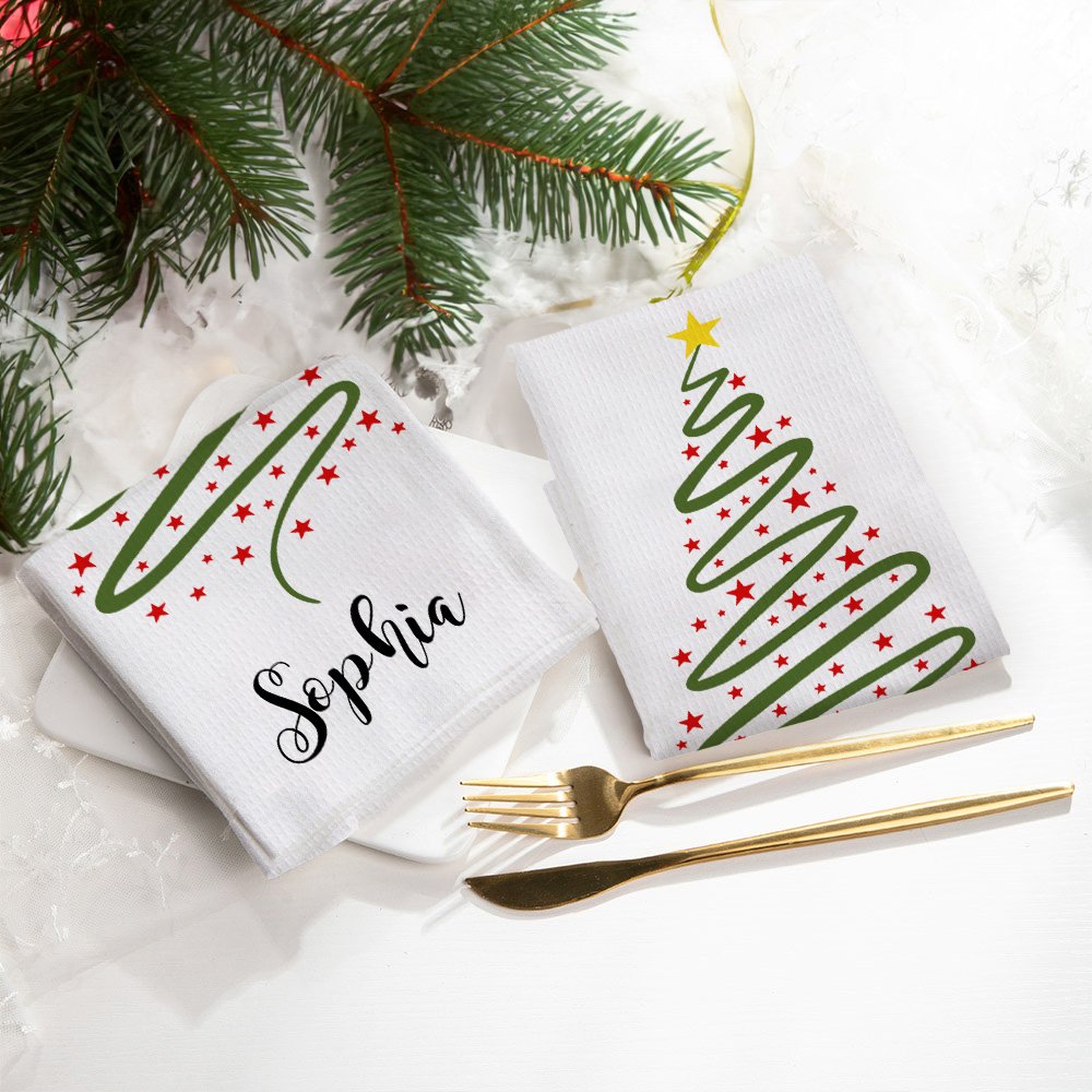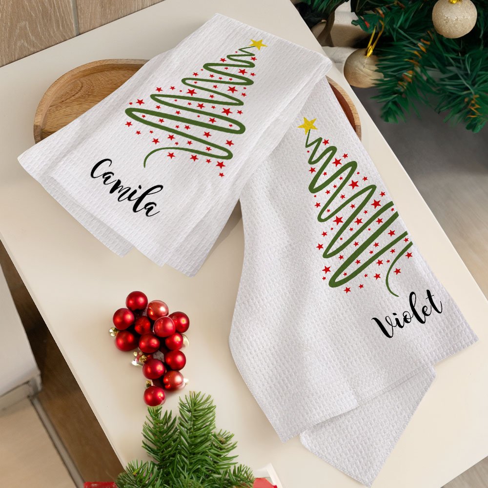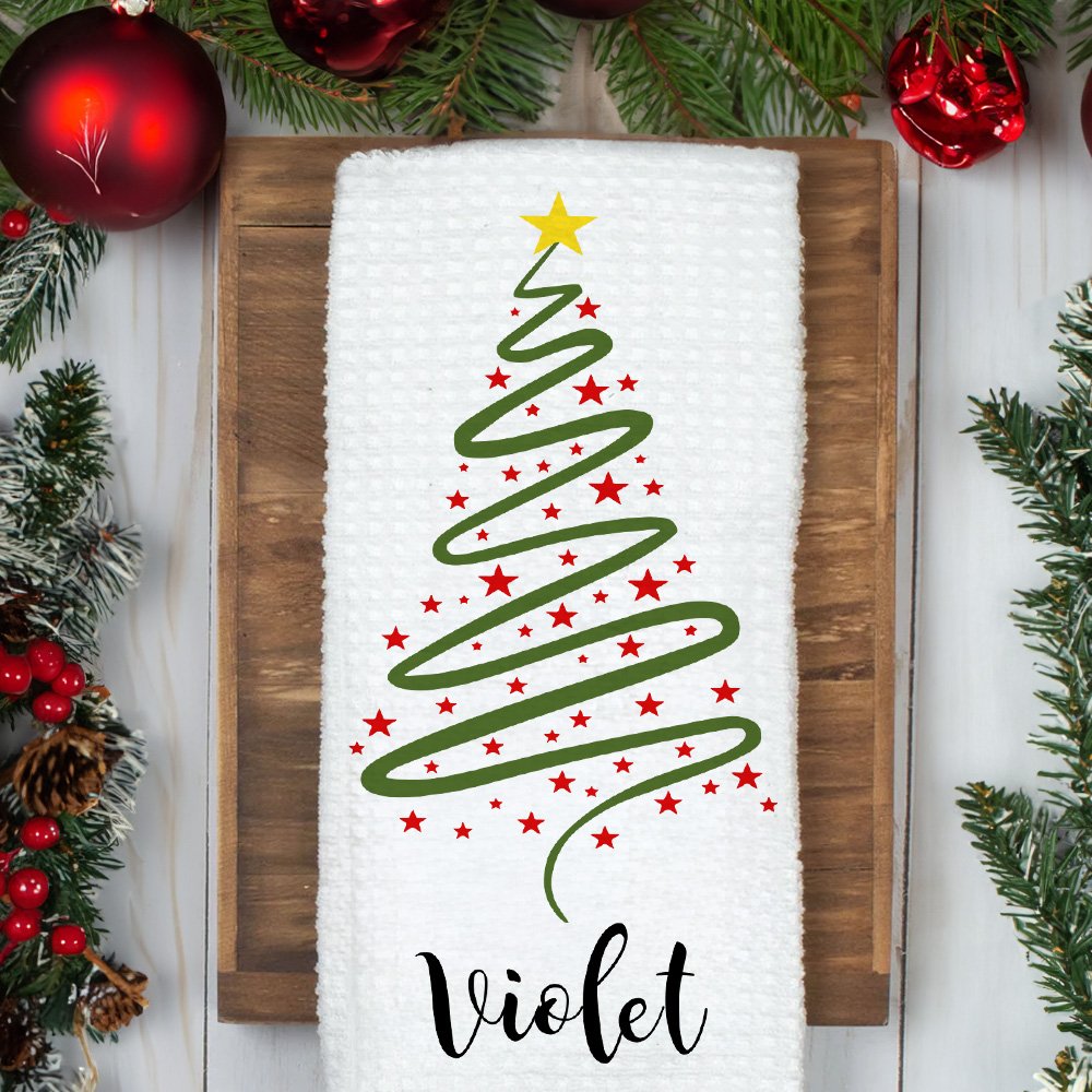Le motif principal de cette serviette est un arbre de Noël, avec des lignes vertes délimitant un simple arbre de Noël parsemé d'étoiles rouges et plein de couleurs magiques. Vous pouvez y ajouter votre nom pour créer un souvenir unique.