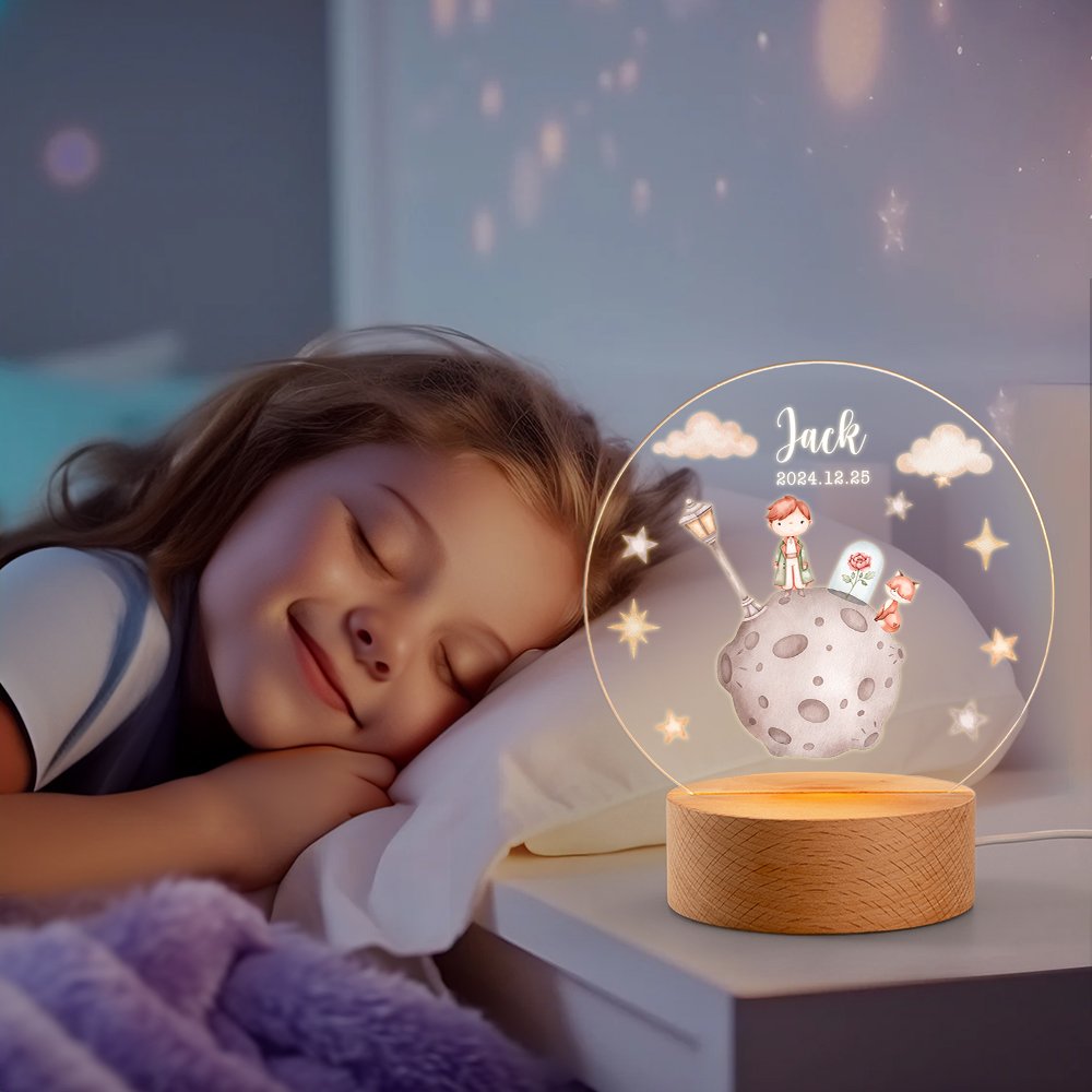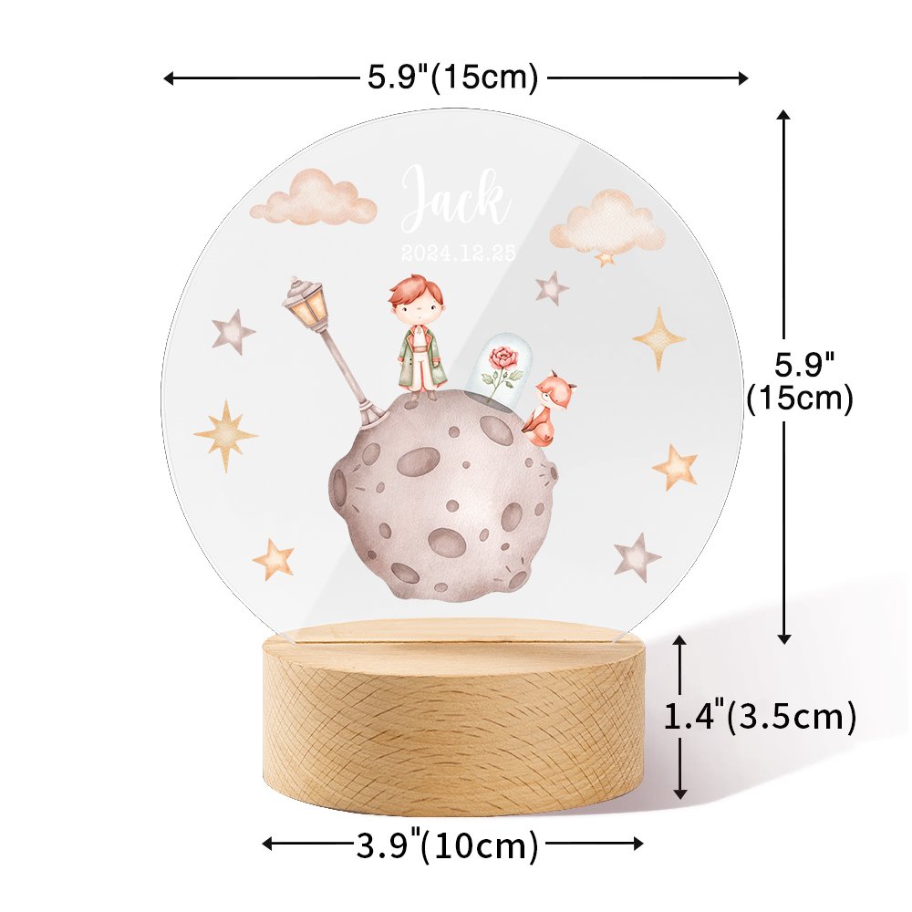 Cette veilleuse présente un magnifique motif en acrylique représentant le prince debout sur une planète avec une rose et un renard, entouré de nuages et d'étoiles. Elle crée une ambiance de rêve parfaite pour une chambre d'enfant.