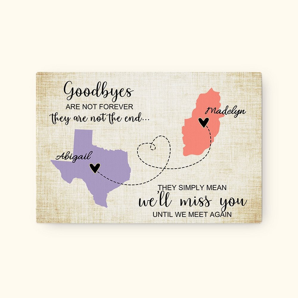 Cette peinture sur toile est conçue avec deux cartes de différents états reliées par un cœur et une ligne, symbolisant que bien que nous soyons loin l'un de l'autre, notre relation est profonde. Vous pouvez l'assortir à l'un des textes de titre que nous fournissons, choisir une carte de votre lieu de résidence et de celui de l'autre personne, et ajouter votre nom pour créer un souvenir unique.