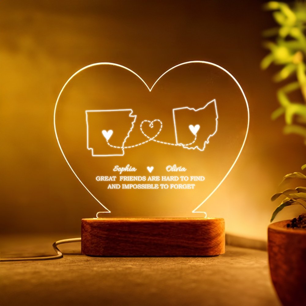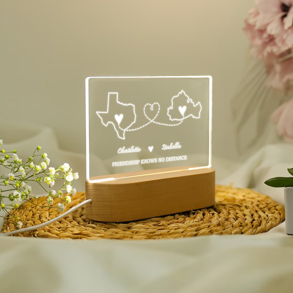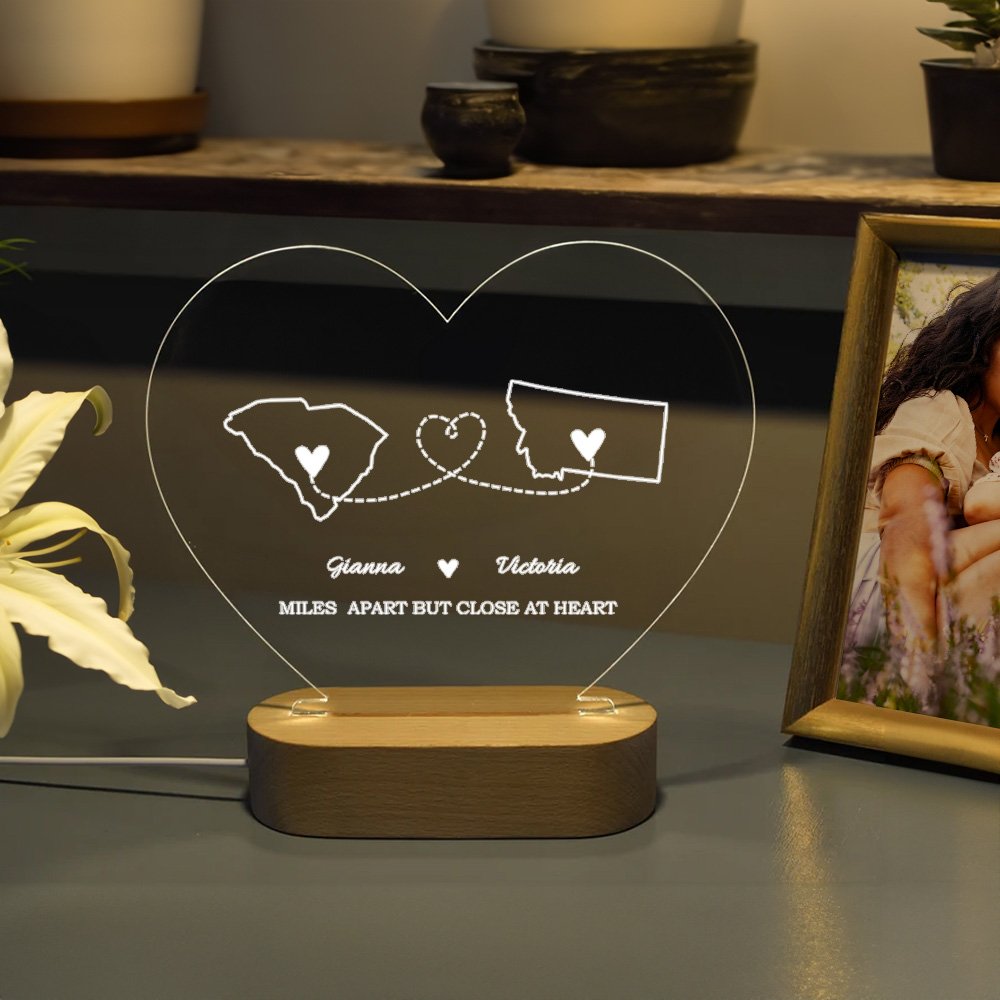 Cette magnifique plaque est conçue avec deux cartes de différents états reliées par un cœur et une ligne, symbolisant que même si nous sommes loin l'un de l'autre, notre relation est profonde. Vous pouvez l'assortir du titre que nous fournissons, choisir une carte de votre lieu de résidence et de celui de l'autre personne, et ajouter votre nom pour créer un souvenir unique.