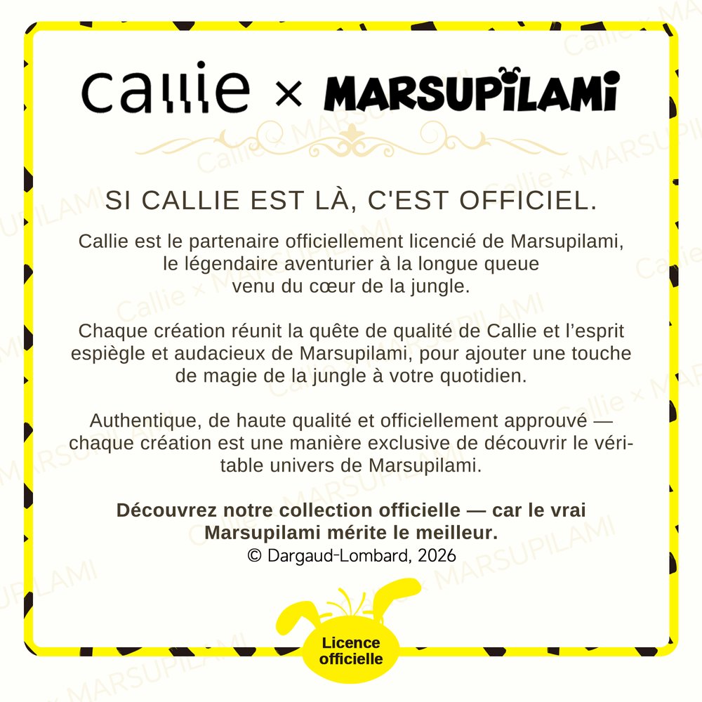 Callie a l'honneur de proposer des produits Marsupilami® sous licence officielle en collaboration avec le détenteur des droits de ce dessin animé belge emblématique. Nous fabriquons des produits de haute qualité qui capturent de manière authentique le charme intemporel du Marsupilami. Nous garantissons une authenticité à 100 %, ce qui vous permet de ramener chez vous ce trésor de joie et de nostalgie que sont les dessins animés classiques, en toute confiance.