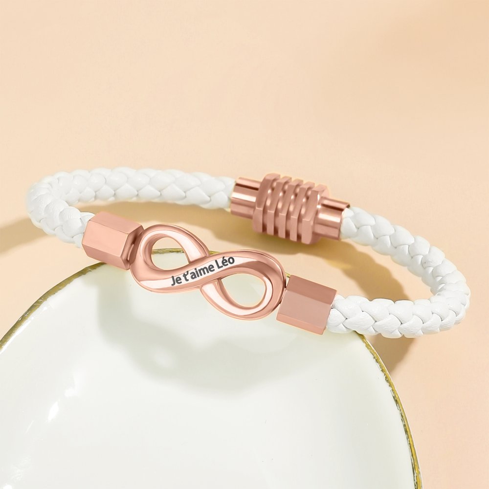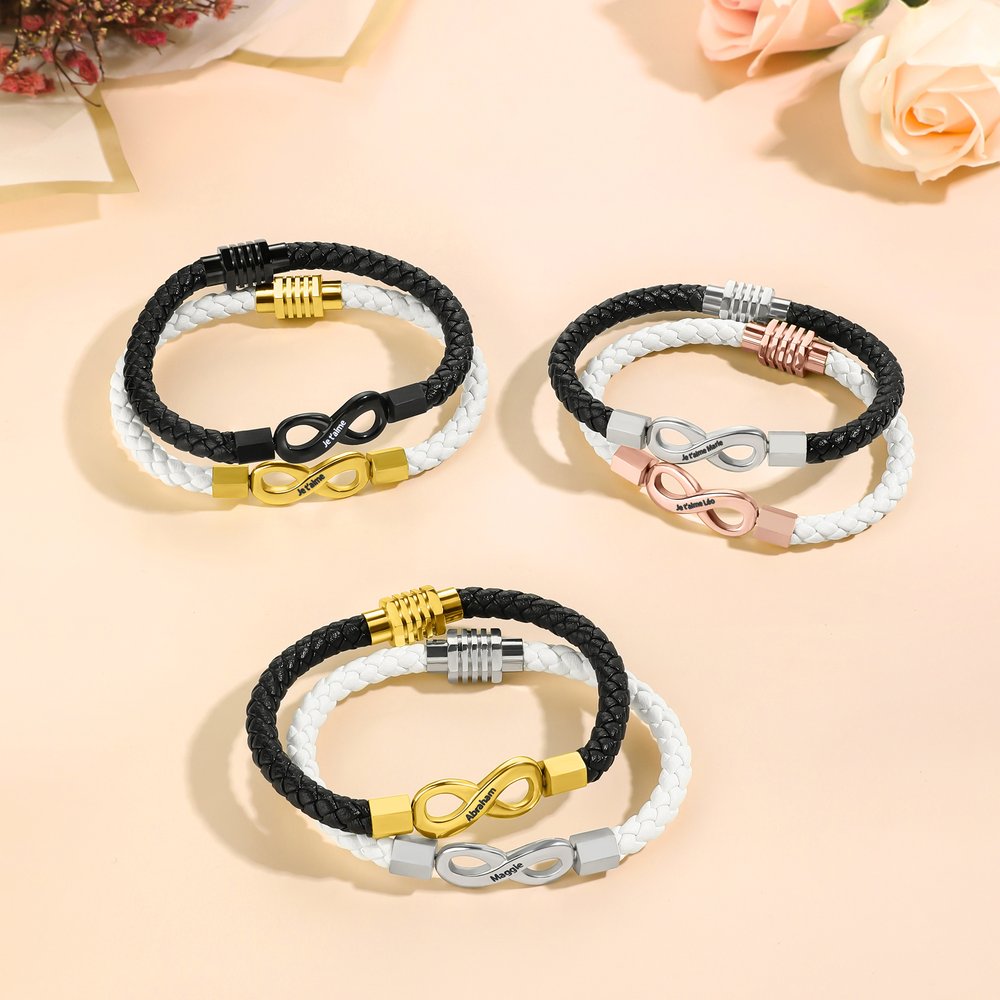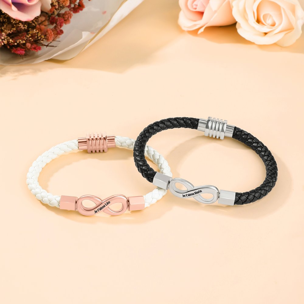 Ce bracelet assorti personnalisé présente le symbole de l'infini, symbole de l'éternité, comme élément central du design, incarnant délicatement la signification romantique de l'amour sans fin. L'aspect le plus captivant est la personnalisation poussée. Nous proposons un texte personnalisé à l'intérieur du symbole de l'infini, ce qui vous permet de créer une pièce précieuse, qu'il s'agisse de votre nom ou d'un message personnel.
