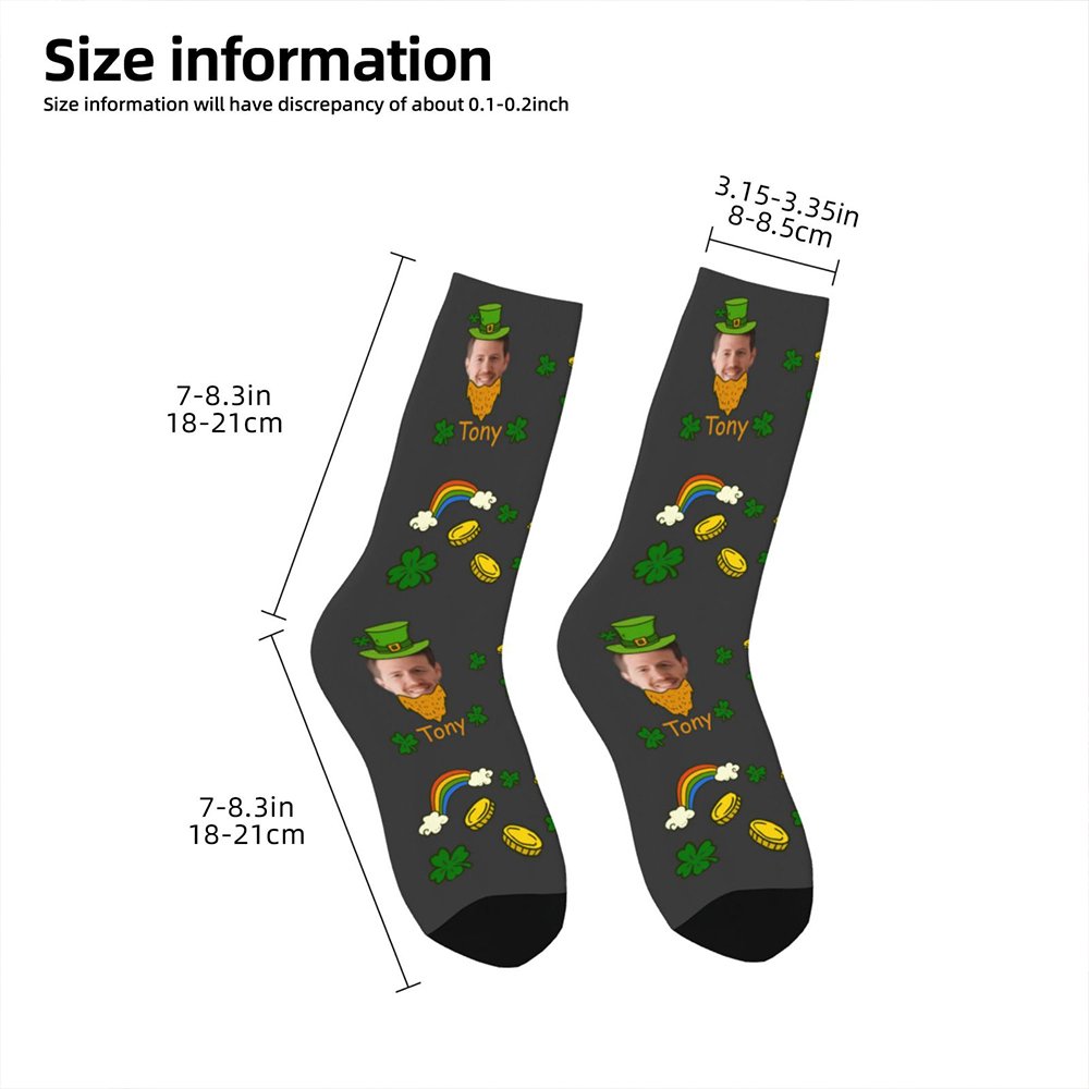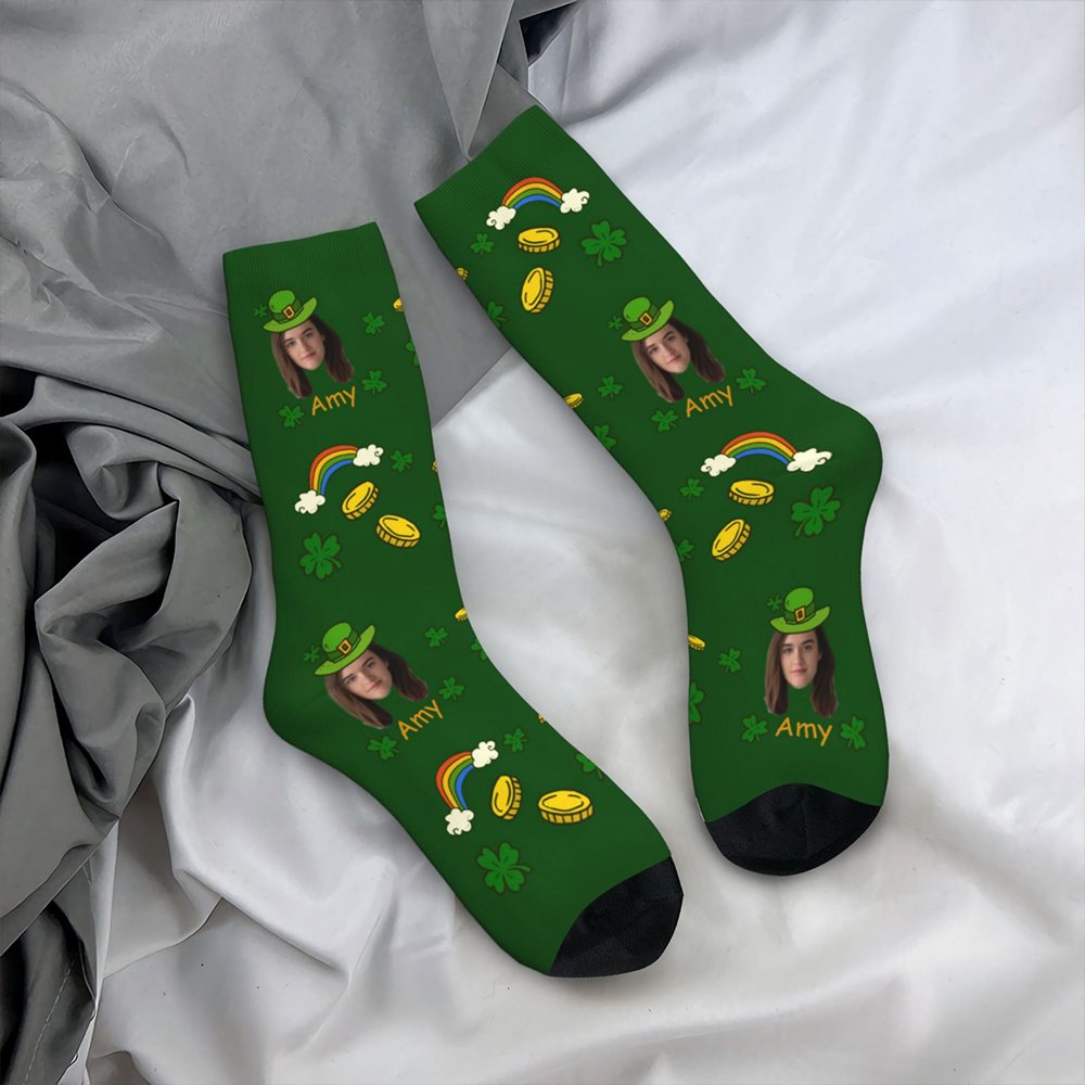 Cette chaussette présente un motif unique de trèfle porte-bonheur avec un arc-en-ciel et des pièces de monnaie en or. Le motif du trèfle, qui symbolise l'espoir, l'amour véritable et la chance, est intégré de manière artistique dans les chaussettes, ce qui signifie qu'elles sont pleines d'énergie porteuse de chance. Ce design créatif et à la mode convient non seulement aux tenues décontractées quotidiennes, mais il ajoute également une touche de couleur à votre tenue. Les chaussettes peuvent être personnalisées avec un nom et une photo de votre choix pour que ce cadeau soit vraiment significatif et spécial.