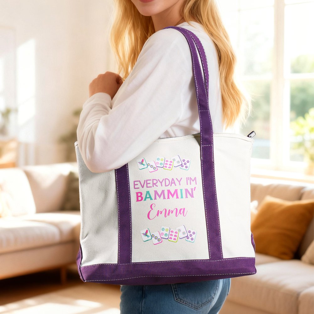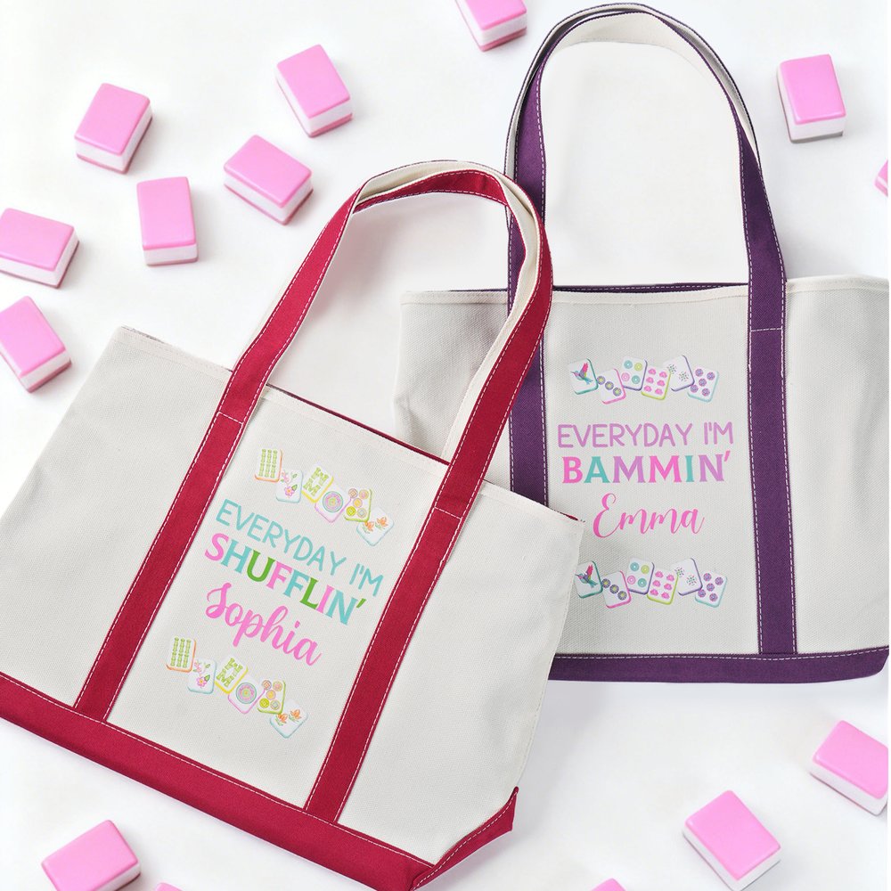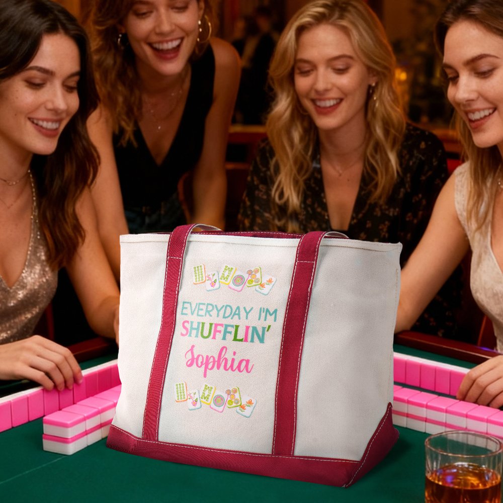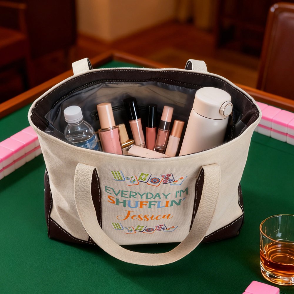 Ce sac fourre-tout présente un design distinctif qui incorpore de manière créative des éléments de mahjong. Il peut être personnalisé avec des noms et des textes, ce qui en fait un choix idéal pour les amateurs de mahjong qui souhaitent exprimer leur amour pour ce jeu.