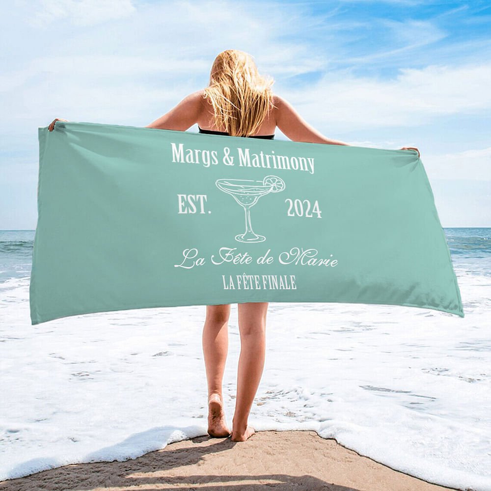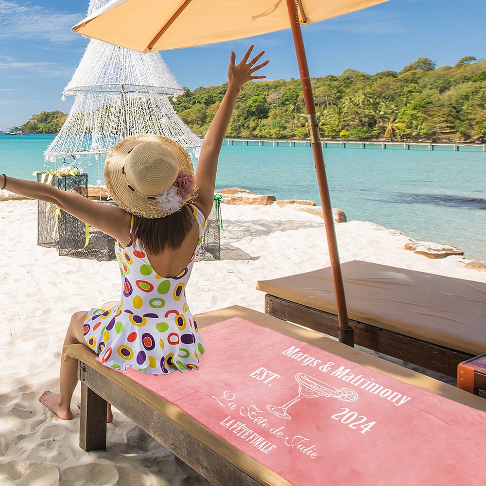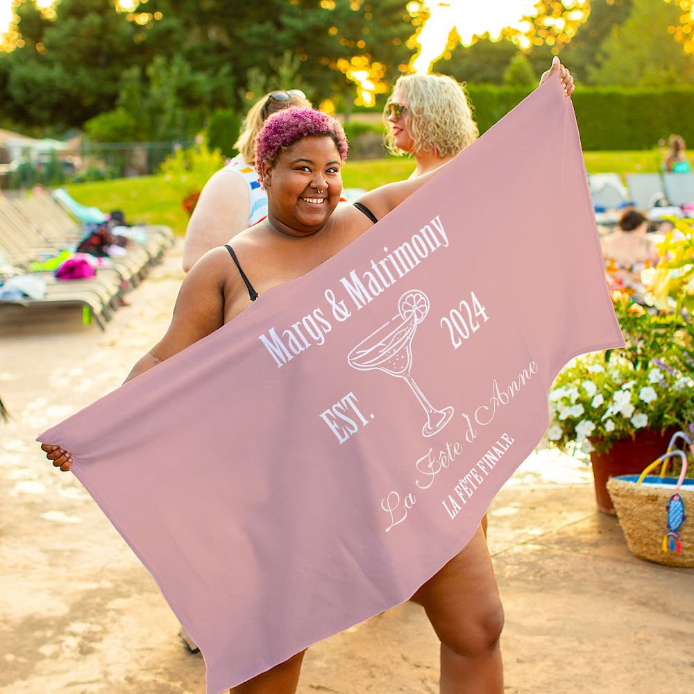 Cette serviette de plage présente un ravissant motif personnalisé, parfait pour ajouter un peu de fantaisie à votre enterrement de vie de jeune fille ou à la célébration de votre mariage. Vous pouvez personnaliser l'année et deux lignes de texte, faisant de cette serviette de plage un souvenir mémorable de cette occasion spéciale.