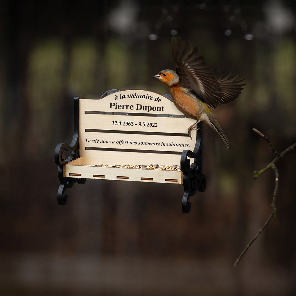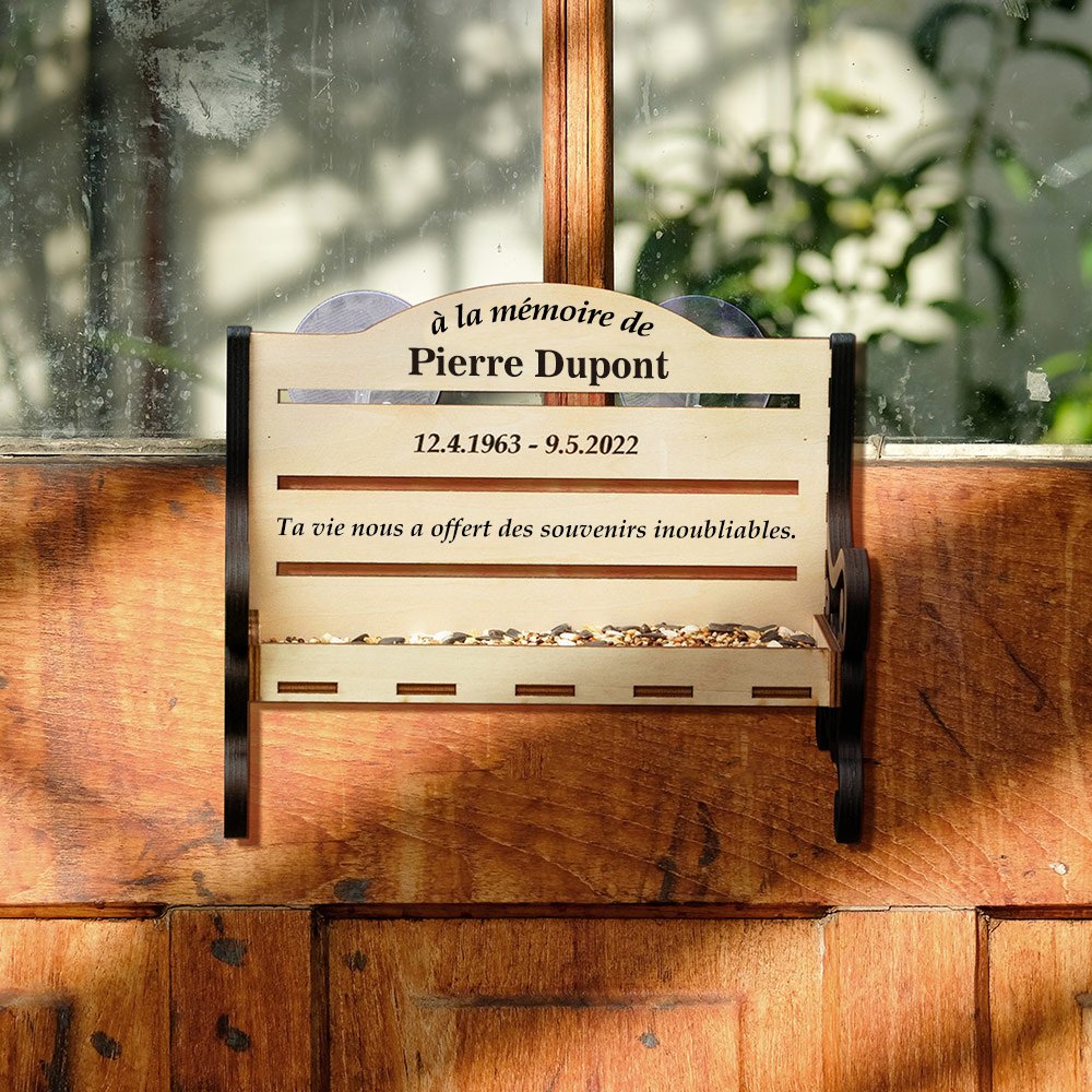 Lorsque des personnes sont touchées par la perte d'un membre de leur famille ou d'un ami, nous pouvons leur envoyer un cadeau de sympathie pour atténuer leur douleur ou leur apporter un peu de réconfort. La mangeoire de fenêtre a été conçue sous la forme d'une chaise commémorative. L'association d'une personne avec une chaise commémorative et une mangeoire permet aux proches de sentir que la vie continue et évoque de bons souvenirs de la personne décédée.