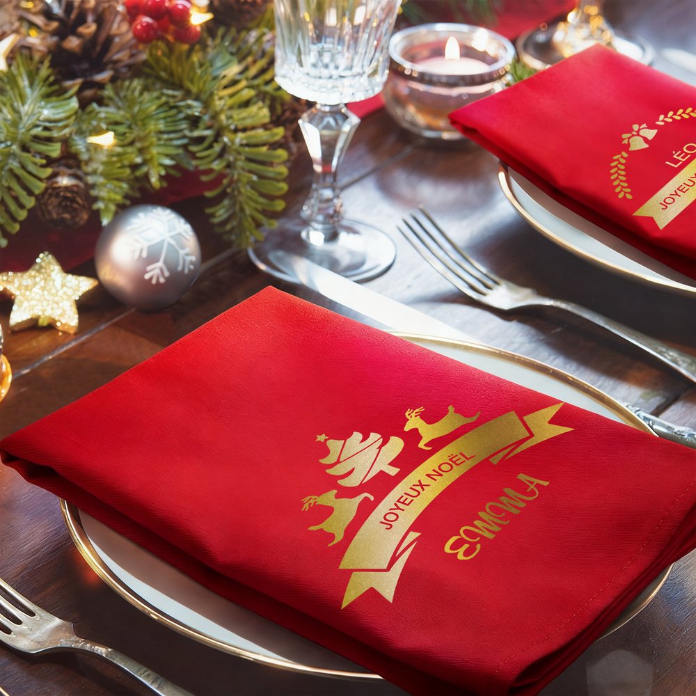 Les serviettes de table de Noël sont conçues pour créer une atmosphère festive et comprennent des éléments tels que des rennes, des cloches et des arbres de Noël. Les motifs sont rouges pour les serviettes blanches et dorés pour les serviettes rouges. Vous pouvez également personnaliser les serviettes avec les noms de votre famille et de vos amis, ainsi qu'un texte réconfortant comme "MERRY CHRISTMAS", pour créer instantanément une décoration de table unique.