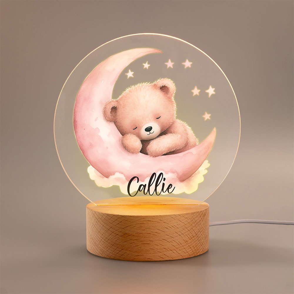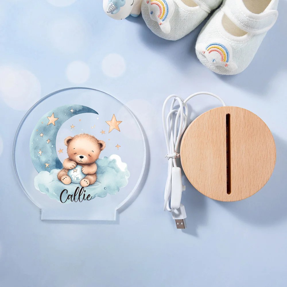 Veilleuse LED Acrylique Personnalisée avec Nom Style Bébé Ourson Endormi Décoration de Chambre avec Socle en Bois Cadeau Noël pour Garçons et Filles
