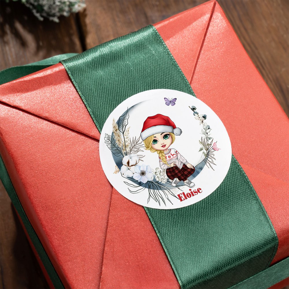 Ces autocollants attrayants ont pour thème Noël. Ils représentent un adorable personnage de dessin animé coiffé d'un bonnet de Père Noël, agrémenté de détails délicats tels que des fleurs de coton, des feuilles et des papillons, le tout surmonté d'un croissant de lune. Personnalisez-les avec votre nom pour ajouter une touche spéciale à votre cadeau de Noël.
