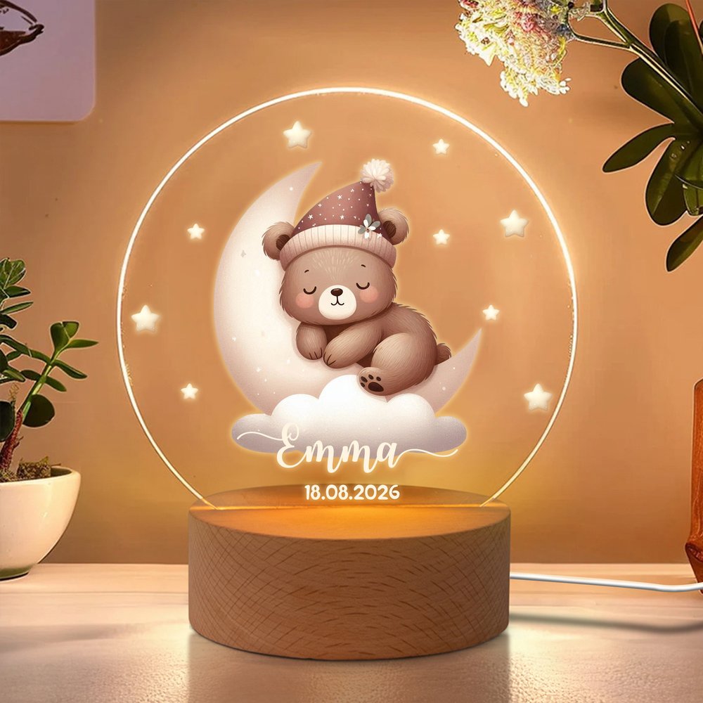 Cette veilleuse présente une scène adorable d'un animal de dessin animé dormant paisiblement sur la lune, entouré d'étoiles scintillantes, créant une atmosphère rêveuse et chaleureuse. Nous proposons 19 motifs d'animaux différents et vous pouvez personnaliser le nom et la date de naissance de l'enfant, ce qui fait de chaque veilleuse une œuvre d'art unique, pleine d'humour et de personnalité, parfaite pour la chambre de n'importe quel enfant.