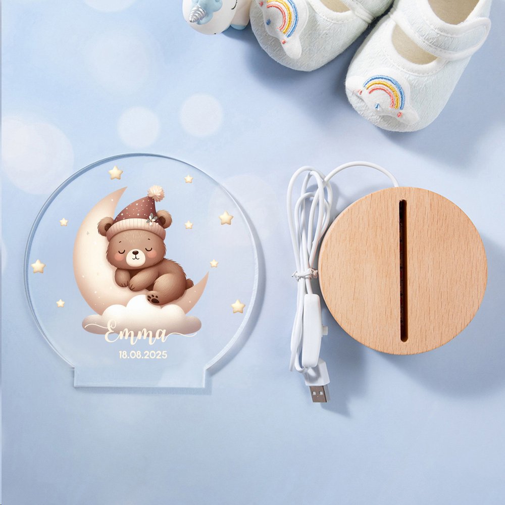 Cette veilleuse présente une scène adorable d'un animal de dessin animé dormant paisiblement sur la lune, entouré d'étoiles scintillantes, créant une atmosphère rêveuse et chaleureuse. Nous proposons 19 motifs d'animaux différents et vous pouvez personnaliser le nom et la date de naissance de l'enfant, ce qui fait de chaque veilleuse une œuvre d'art unique, pleine d'humour et de personnalité, parfaite pour la chambre de n'importe quel enfant.