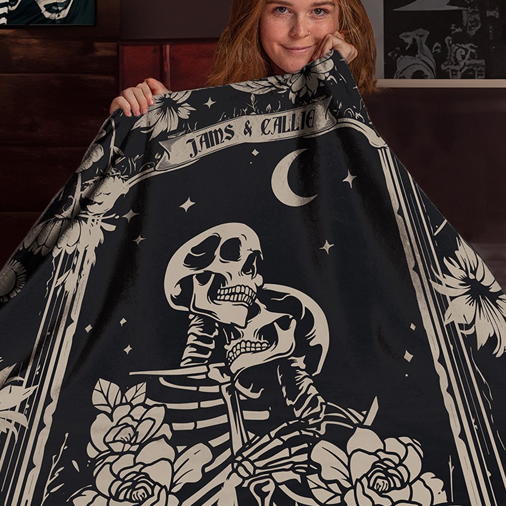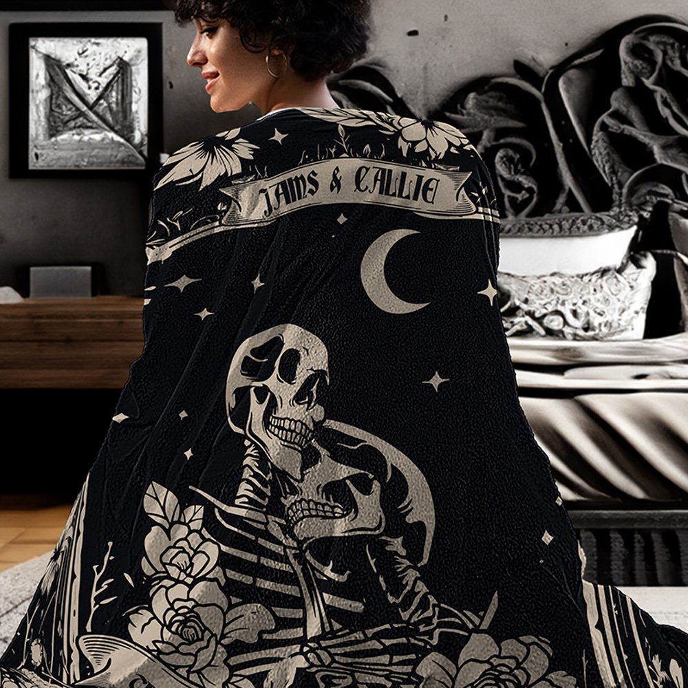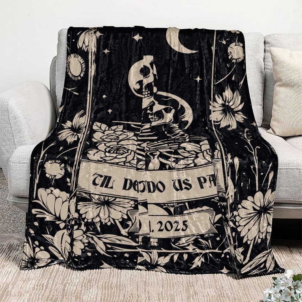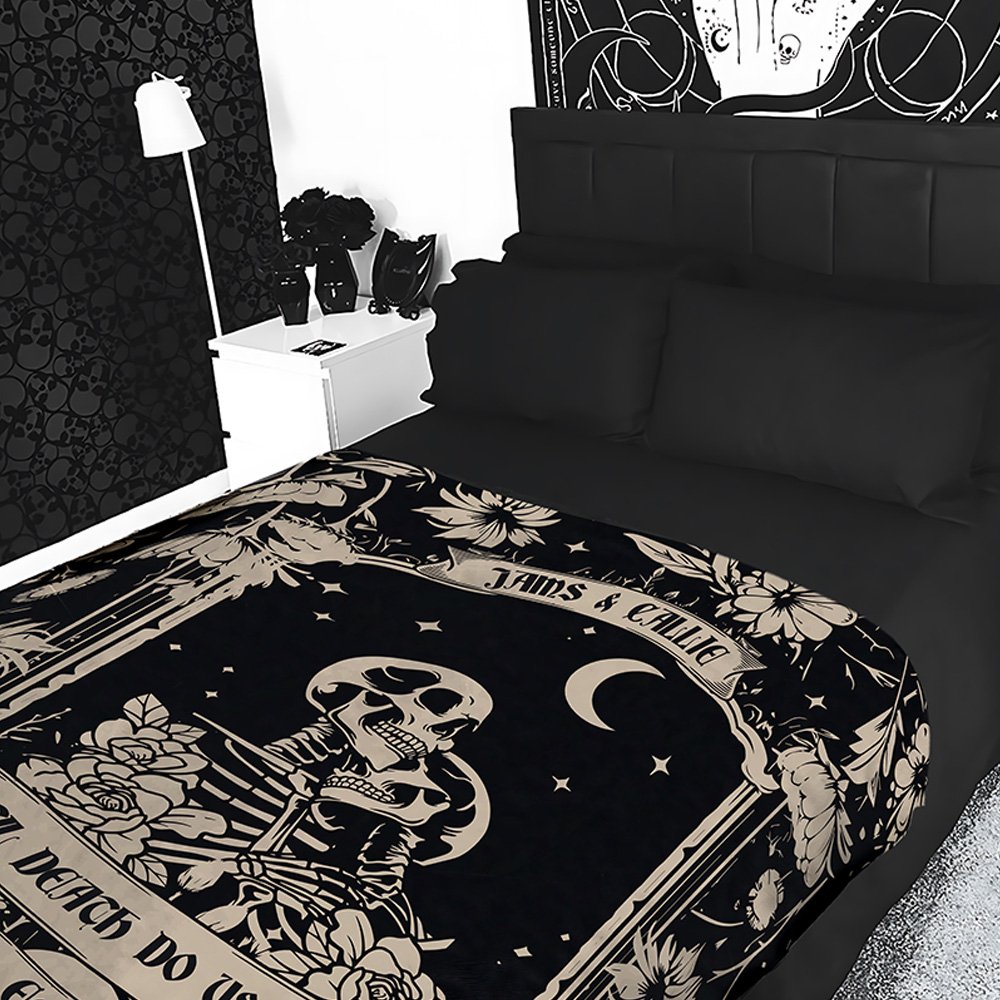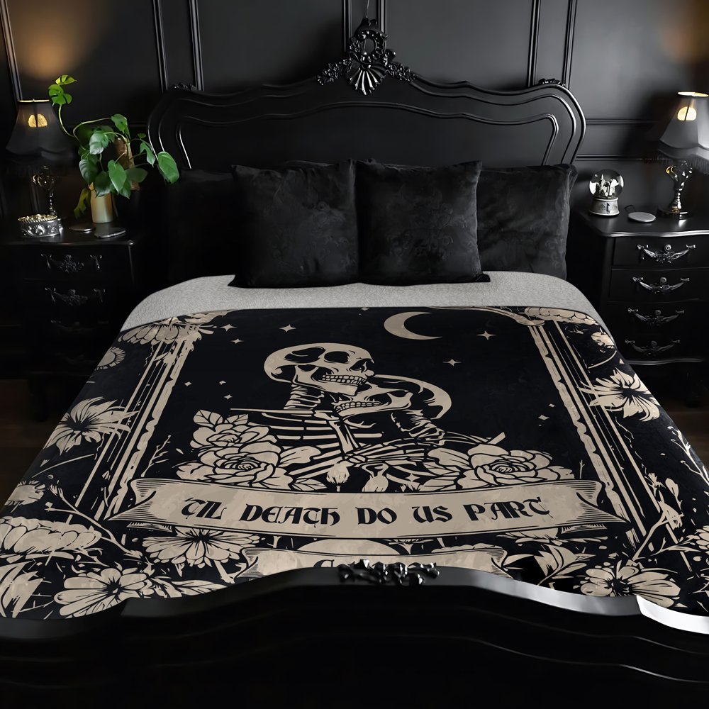 Cette exquise couverture est ornée d'un captivant motif gothique représentant deux crânes enlacés sur fond de lune lumineuse et de fleurs délicates. La phrase poignante "Til Death Do Us Part" ajoute une touche romantique mais macabre, résumant parfaitement l'essence de l'esthétique gothique. Cette œuvre d'art unique transforme la couverture en un objet de décoration saisissant qui raconte une histoire d'amour éternel et d'obscurité.