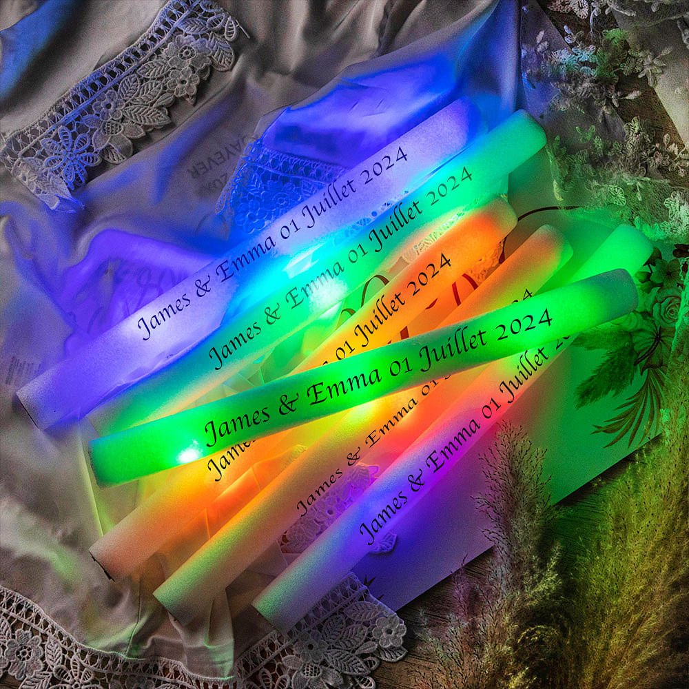 Rendez votre événement encore plus mémorable avec nos bâtons de mousse LED personnalisés. Chaque bâton LED peut être personnalisé avec la police et le texte de votre choix. Notre impression de haute qualité garantit des mots clairs et nets qui feront ressortir vos bâtons lumineux personnalisés dans la foule.
