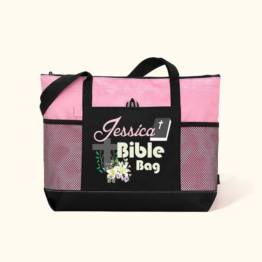 La bible et la croix emblématiques sont la signature de notre sac fourre-tout. La combinaison d'éléments chrétiens et de fleurs souligne le respect des croyances religieuses et symbolise la dévotion des chrétiens.