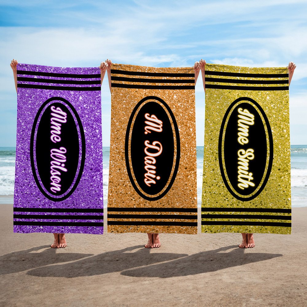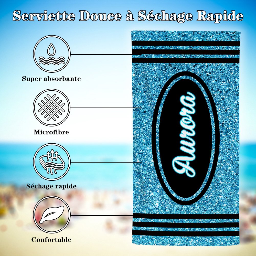 Cette serviette de plage utilise un effet de paillettes de faux crayon pour éblouir la serviette de plage. Vous avez le choix entre huit couleurs différentes. Vous pouvez également personnaliser le nom sur la serviette de plage pour rendre la serviette de plage plus personnalisée.