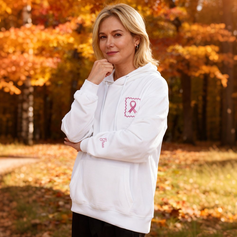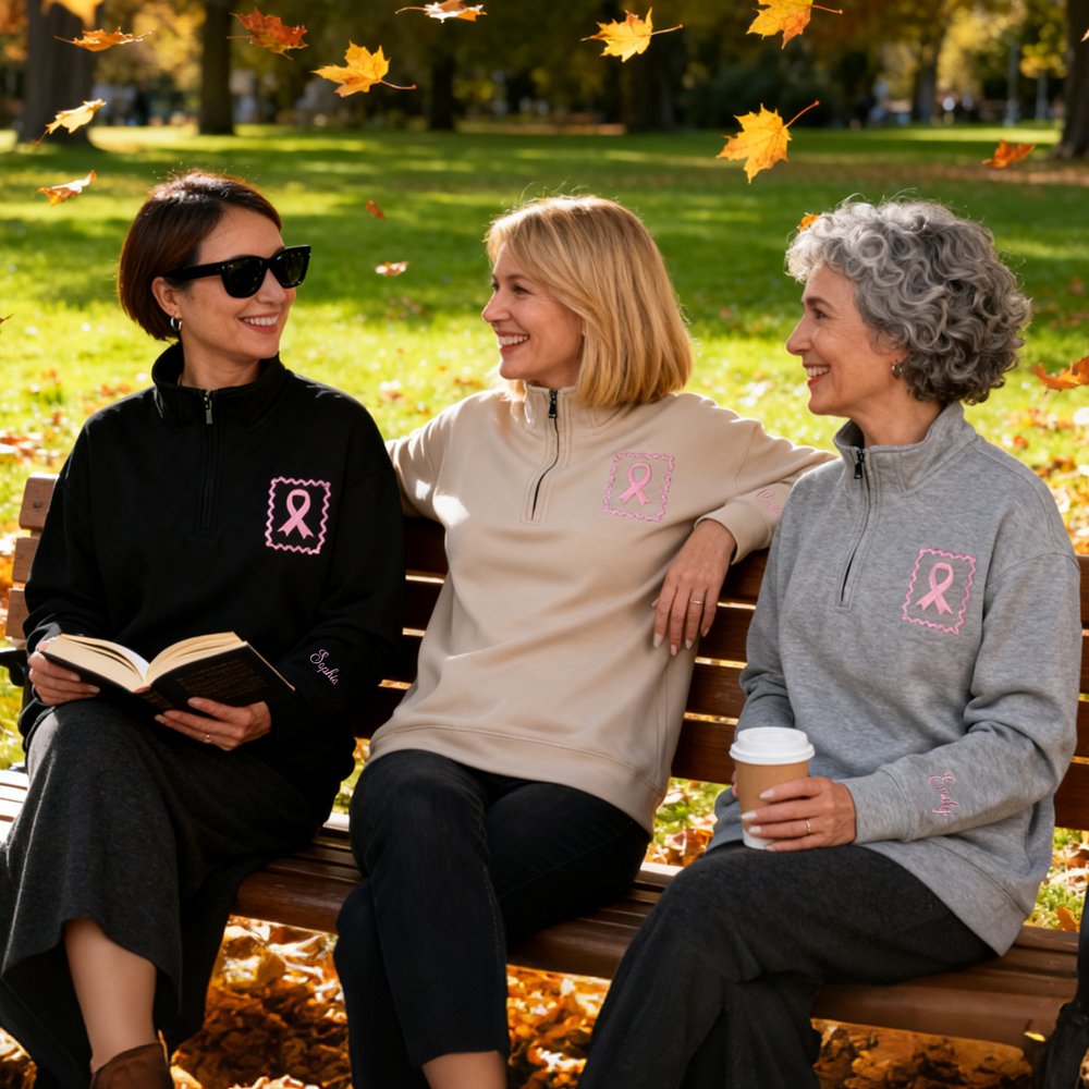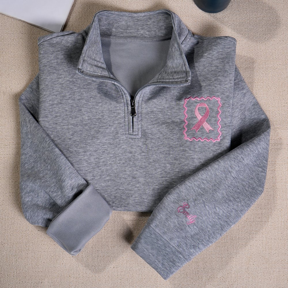 Avec son ruban brodé et sa bordure ondulée, ce modèle intègre la sensibilisation au cancer du sein dans des détails portables. Les poignets peuvent être personnalisés avec un nom, ce qui ajoute une touche d'exclusivité. Disponible en quart de pull-over zippé et en sweat à capuche, il se décline en plusieurs couleurs pour convenir à tous les goûts, alliant subtilité, chaleur et message d'attention dans les vêtements de tous les jours.