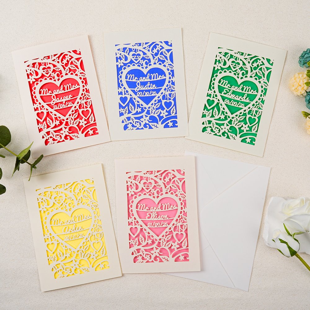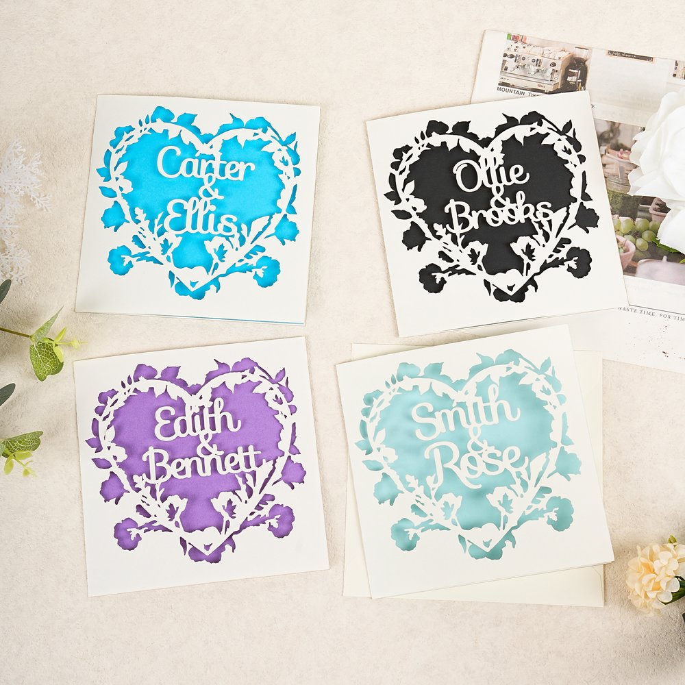 La carte présente un élégant motif floral en forme de cœur, orné d'une douce palette multicolore qui apporte une touche de charme. Disponible en deux tailles raffinées, elle peut être personnalisée avec des noms et une date importante, faisant de chaque pièce une représentation unique et intemporelle d'un lien spécial.