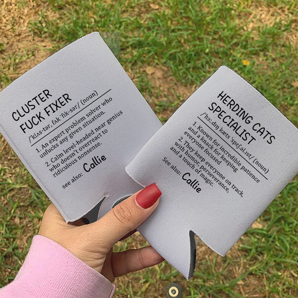 Ce refroidisseur de canettes est doté d'un texte unique. Avec des noms, des boutades et des explications, vous avez le choix entre huit textes de caractères - DEADLINE WARRIOR, HERDING CATS SPECIALIST, INTROVERTED SOCIAL BUTTERFLY, COFFEE-DEPENDENT LIFE FORM, MASTER OF THE MESS, HUNMAN BS DETECTOR, QUEEN OF SARCASM, CLUSTER FUCK FIXER - pour montrer votre singularité.