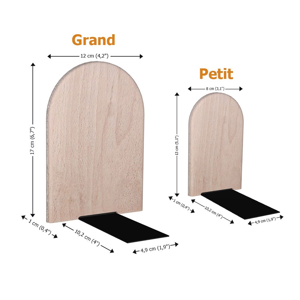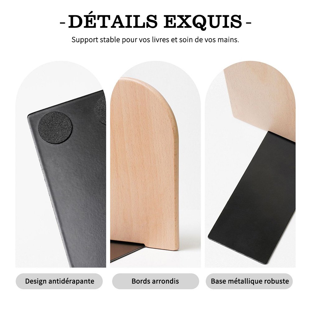 Le corps principal est fabriqué en hêtre de première qualité, connu pour sa robustesse et sa durabilité qui lui permettent de résister à un usage régulier tout en conservant sa forme. Chaque détail est soigneusement poli pour garantir un aspect lisse, impeccable et sans bavure. La base est fabriquée en fer de haute qualité et offre un support solide à ces serre-livres.