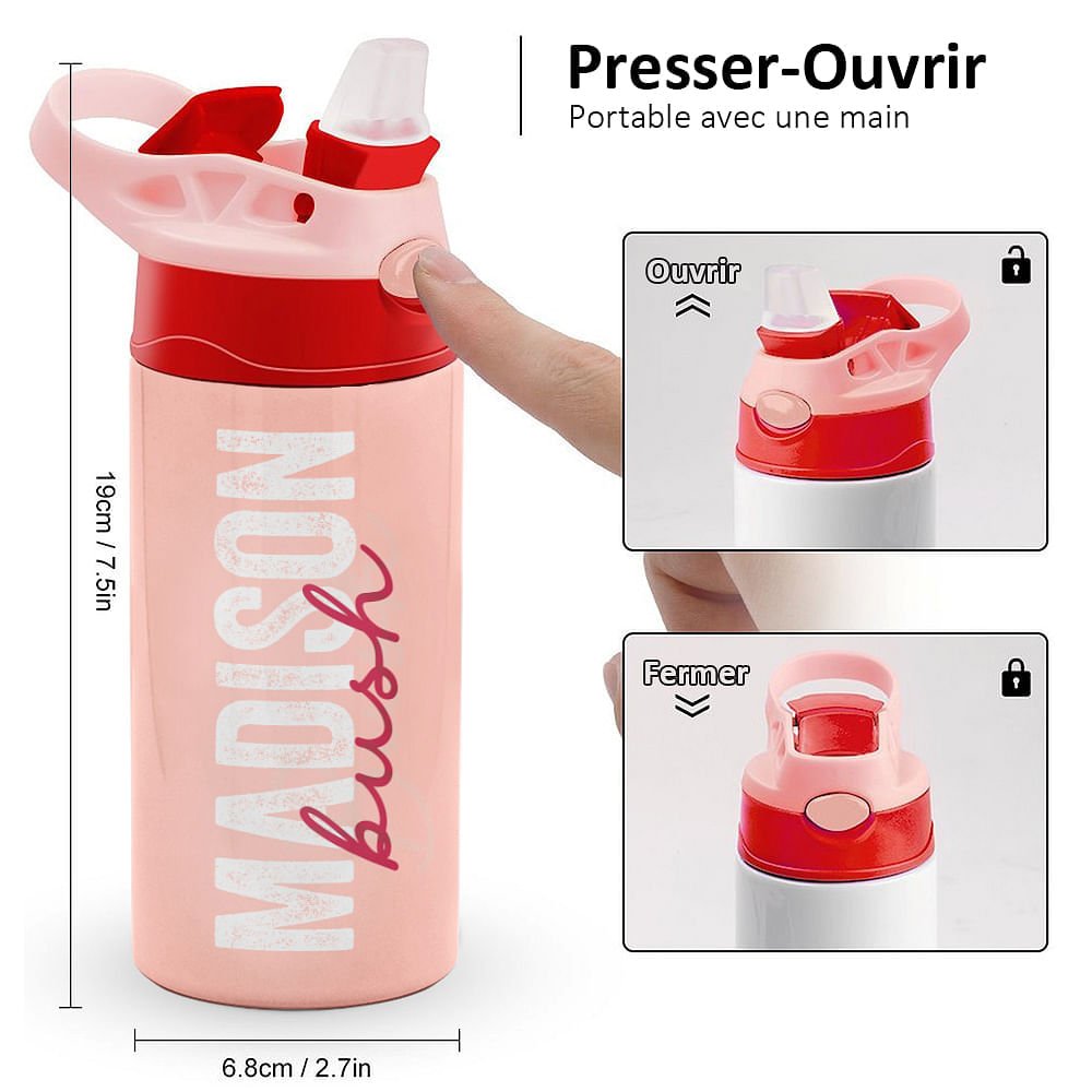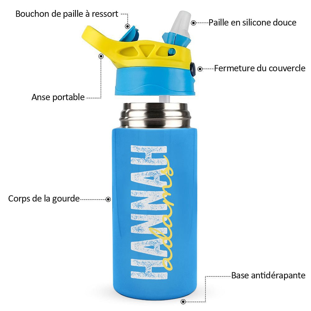 Avec le nom complet de votre enfant en caractères gras et accrocheurs, cette bouteille devient un accessoire unique et significatif qui célèbre son individualité. Qu'il se rende à son premier jour d'école, qu'il prépare son repas pour une sortie scolaire ou qu'il apprécie simplement une boisson fraîche par une chaude journée, cette bouteille d'eau lui permettra de se sentir spécial et fier de l'appeler la sienne.
