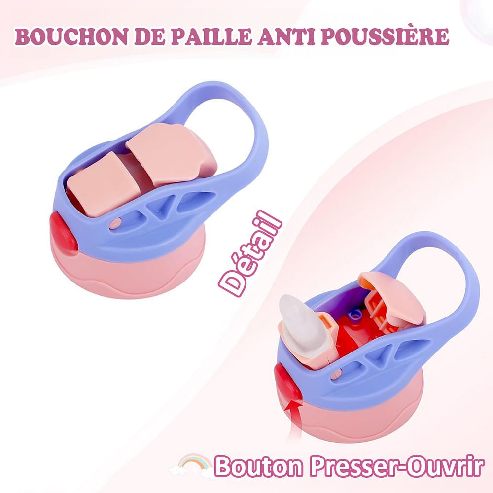 Fabriquée à partir de matière de haute qualité sans BPA, cette gourde est conçue pour durer et résister aux rigueurs d'une utilisation quotidienne sans compromettre le style. L'isolation à double paroi permet de garder les boissons fraîches ou agréablement chaudes, ce qui en fait le compagnon idéal pour les jeux en plein air, les activités sportives ou les longues journées d'école. Avec une paille en silicone pratique, une poignée sécurisée et un couvercle encliquetable, votre enfant peut facilement siroter et transporter ses boissons préférées en toute simplicité.