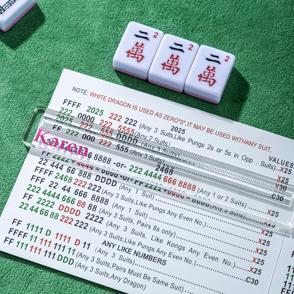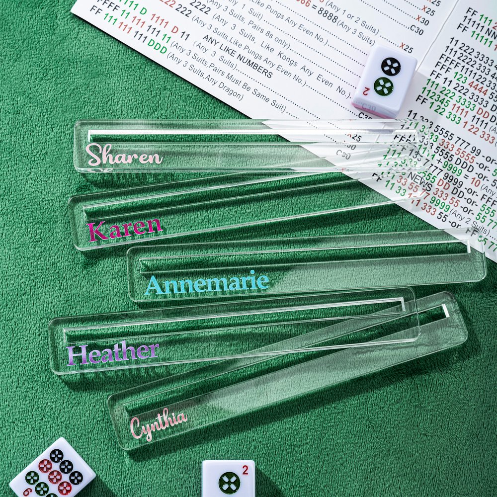 Ce détecteur de lignes de mahjong s'intègre ingénieusement au jeu grâce à son design transparent et minimaliste, à la fois pratique et esthétique. Le nom personnalisable ajoute un sentiment d'exclusivité et de rituel à cet accessoire de jeu, ce qui en fait un élément subtil mais pratique et visuellement attrayant sur la table de mahjong.