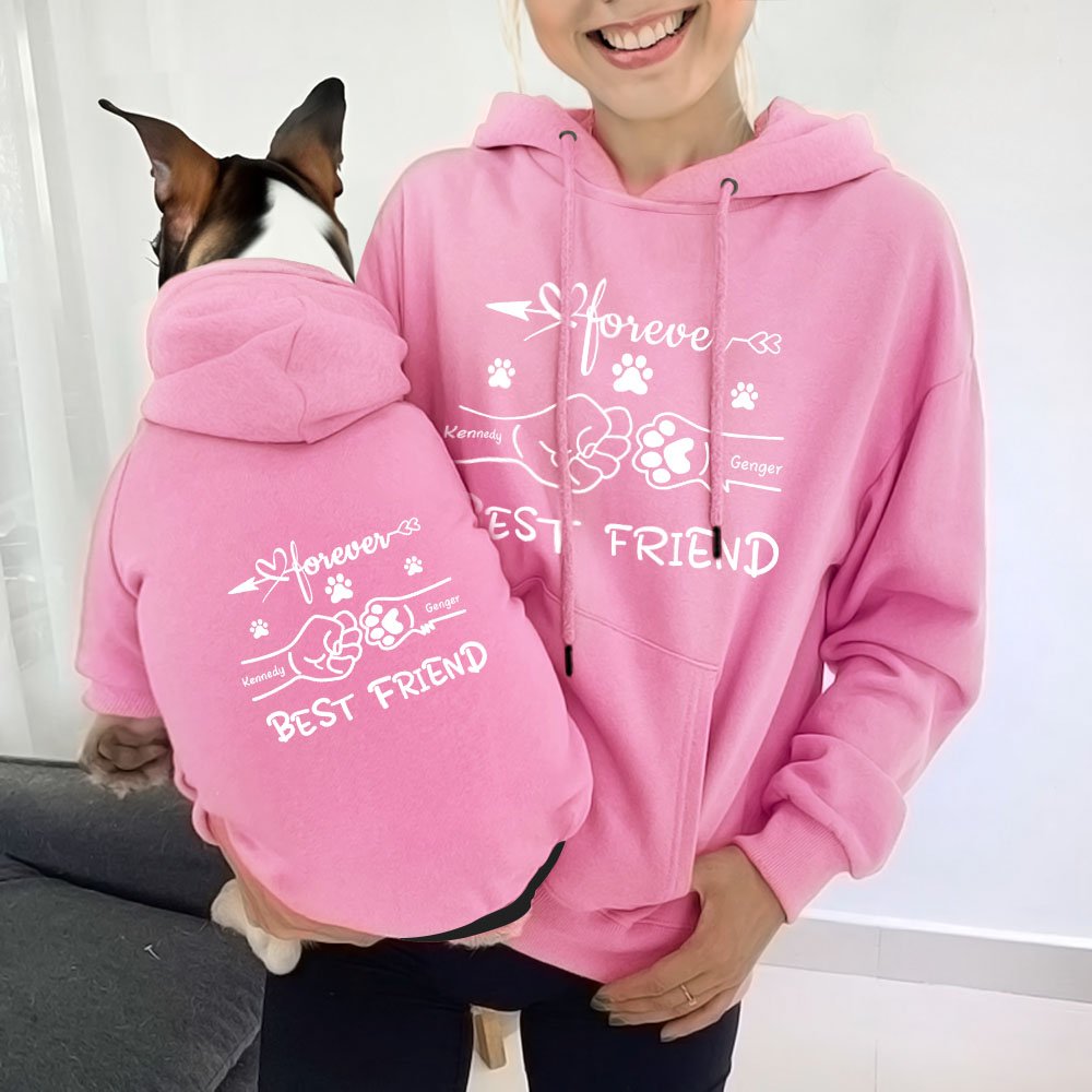 Notre sweat à capuche dessine le poing du propriétaire et la patte de l'animal en forme de " high-five " à travers un design simple, avec des cœurs, des flèches et des empreintes de pattes, l'ensemble est clair et riche, mais pas compliqué. Le slogan "Meilleur ami" ajoute à la couleur émotionnelle de l'ensemble du dessin, exprimant directement l'amour étroit entre le propriétaire et son animal de compagnie.