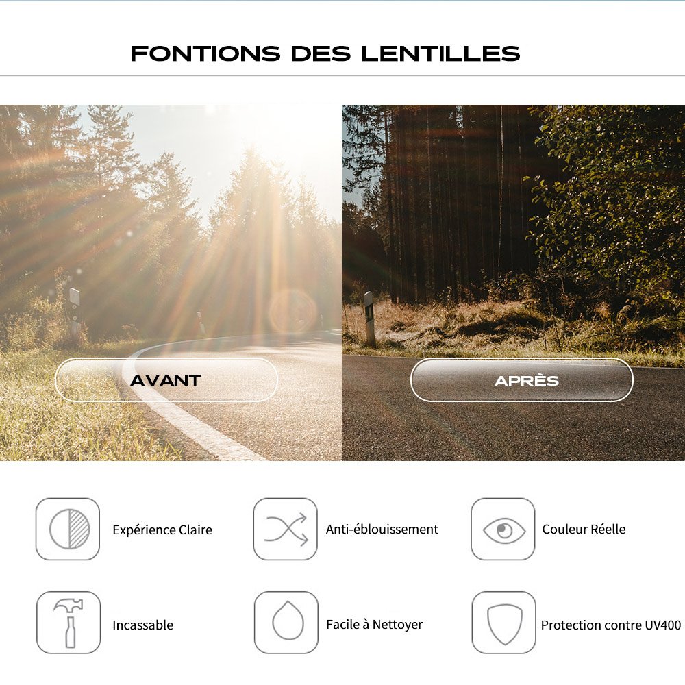 Fabriquée en plastique PC respectueux de l'environnement, la monture est légère et durable, tout en offrant une résistance exceptionnelle aux rayures et aux chocs. Dotées de verres TAC de qualité supérieure, ces lunettes de soleil réduisent efficacement l'éblouissement dû à la route, à l'eau et à la neige, tout en offrant une protection UV fiable contre la lumière directe du soleil lors des activités de plein air.