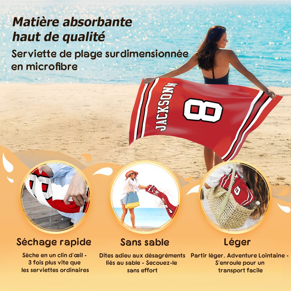 Inspirée des maillots d'athlétisme et associée à des rayures dynamiques, cette serviette de plage rayonne d'énergie juvénile et de style sportif. Personnalisez-la avec un nom et un numéro pour une touche personnelle et ajoutez une signature unique à vos séances d'entraînement et à vos matchs. Disponible en plusieurs couleurs pour correspondre à l'esprit de votre équipe et mettre en valeur votre passion pour le sport.