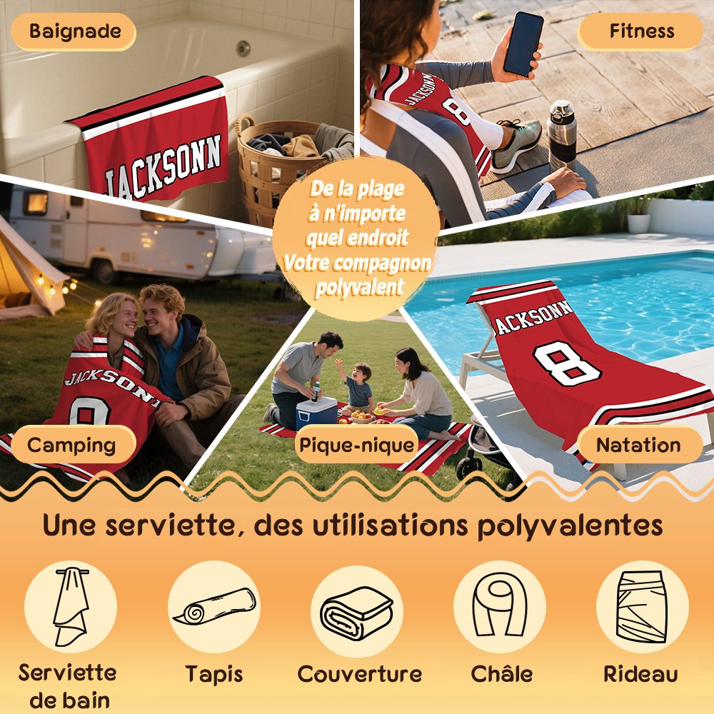 | Caractéristiques: | Super absorbant, séchage rapide, sans sable, durable et doux, surdimensionné, léger et portable, avec un nom et un numéro au design sportif. |