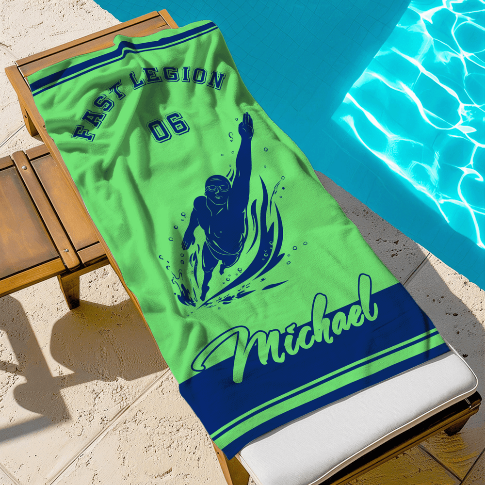 Cette serviette de plage présente un motif dynamique de silhouette de nageur, disponible en plusieurs couleurs, qui évoque l'énergie et le mouvement. Avec le nom personnalisé, chaque amateur de natation peut posséder un sac d'équipement unique en son genre. Son design épuré et minimaliste allie fonctionnalité sportive et style contemporain, exprimant les goûts personnels tout en rendant les articles instantanément reconnaissables.