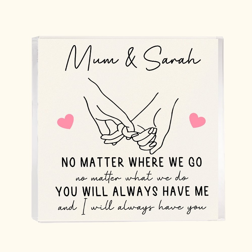Cette plaque acrylique présente un design en forme de cœur ou de carré avec un adorable motif de mains qui se tiennent, symbolisant le lien profond et l'amour entre une mère et son enfant, ce qui en fait un cadeau sincère et significatif.
