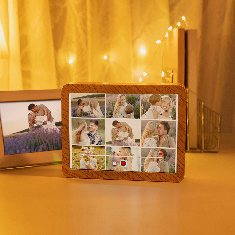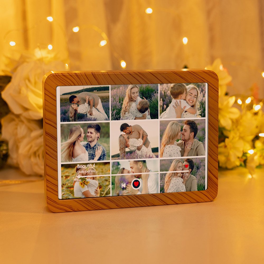 Ce cadre photo miroir utilise une imitation exquise du grain de bois combinée à la technologie moderne du miroir LED pour ajouter une touche de chaleur et de mode à vos précieux souvenirs. Vous avez le choix entre 8 styles de design. Vous pouvez choisir votre disposition préférée et ajouter des photos, des textes, des noms, etc. pour que vos souvenirs restent gravés dans votre mémoire de manière unique. L'effet miroir unique est discret et élégant lorsqu'il n'est pas éclairé, et lorsque la lumière brille, il peut présenter votre contenu personnalisé.