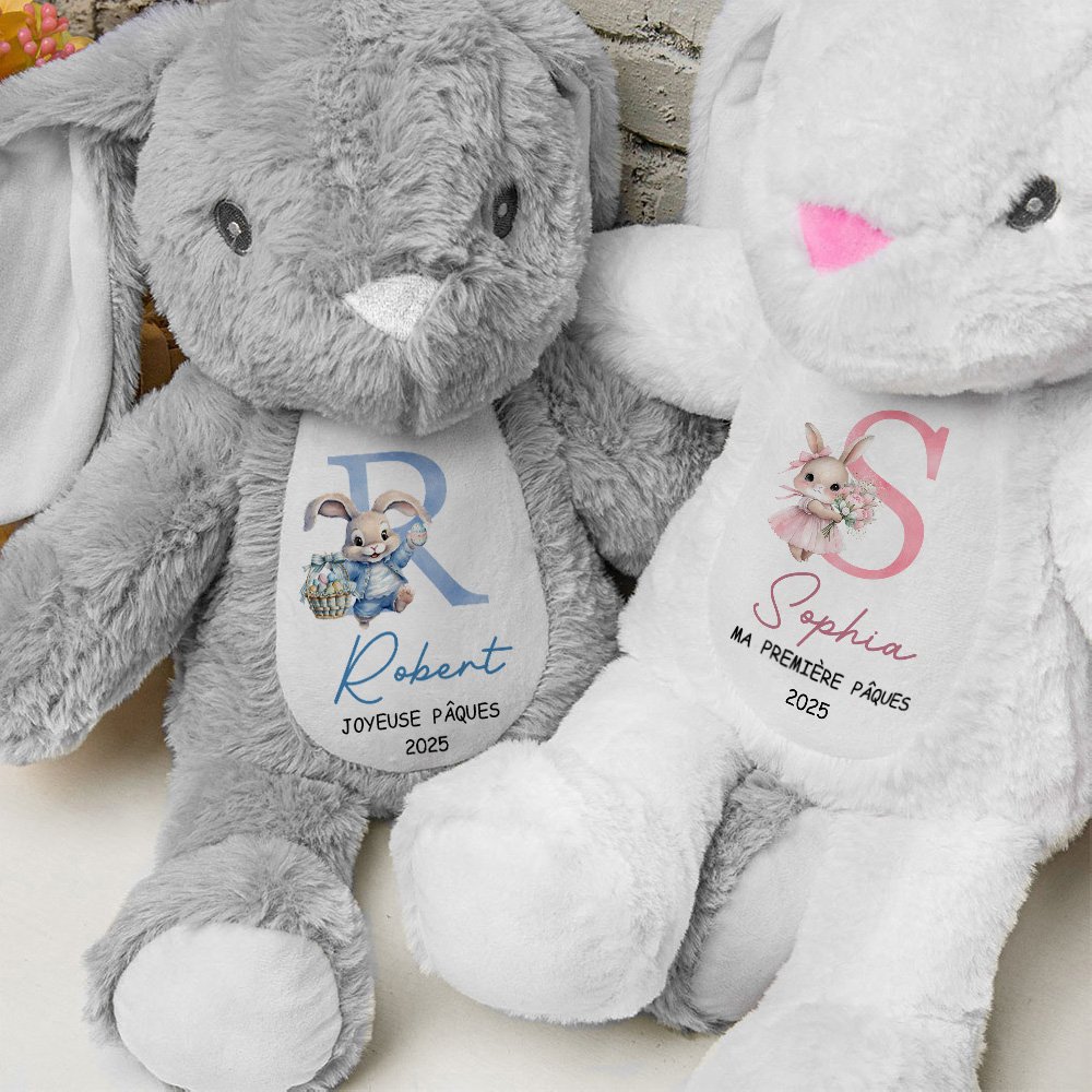 Chaque lapin est fabriqué avec un extérieur incroyablement doux, invitant les enfants à se blottir contre eux. Ce qui distingue vraiment ces jouets, ce sont les adorables illustrations de lapin à base de fleurs. Les illustrations détaillées et colorées, qui représentent un adorable lapin au milieu de fleurs délicates, ajoutent une touche de magie. De plus, l'impression du nom de l'enfant et de l'année importante, comme l'année de sa première Pâques, sur le jouet en peluche en fait un souvenir unique.