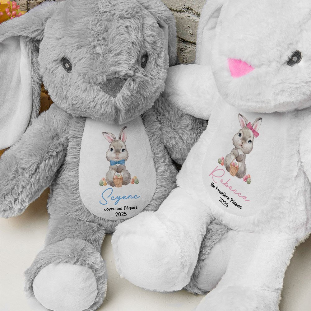 Célébrez les premières Pâques de votre enfant avec notre adorable lapin en peluche personnalisé ! Vous pouvez ajouter le nom de votre enfant, une citation et une année avec un lapin mignon portant un panier d'œufs de Pâques sur son ventre. Cette personnalisation unique transforme le lapin en un souvenir précieux, parfait pour commémorer cette étape importante.