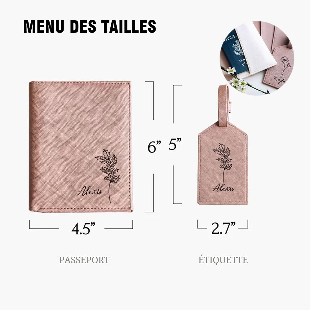Le porte-passeport et l'étiquette de bagage en cuir peuvent être ornés du nom du destinataire et de sa fleur de naissance, symbolisant son mois de naissance et ajoutant une touche d'élégance personnalisée, transformant ces accessoires de voyage en souvenirs uniques.
